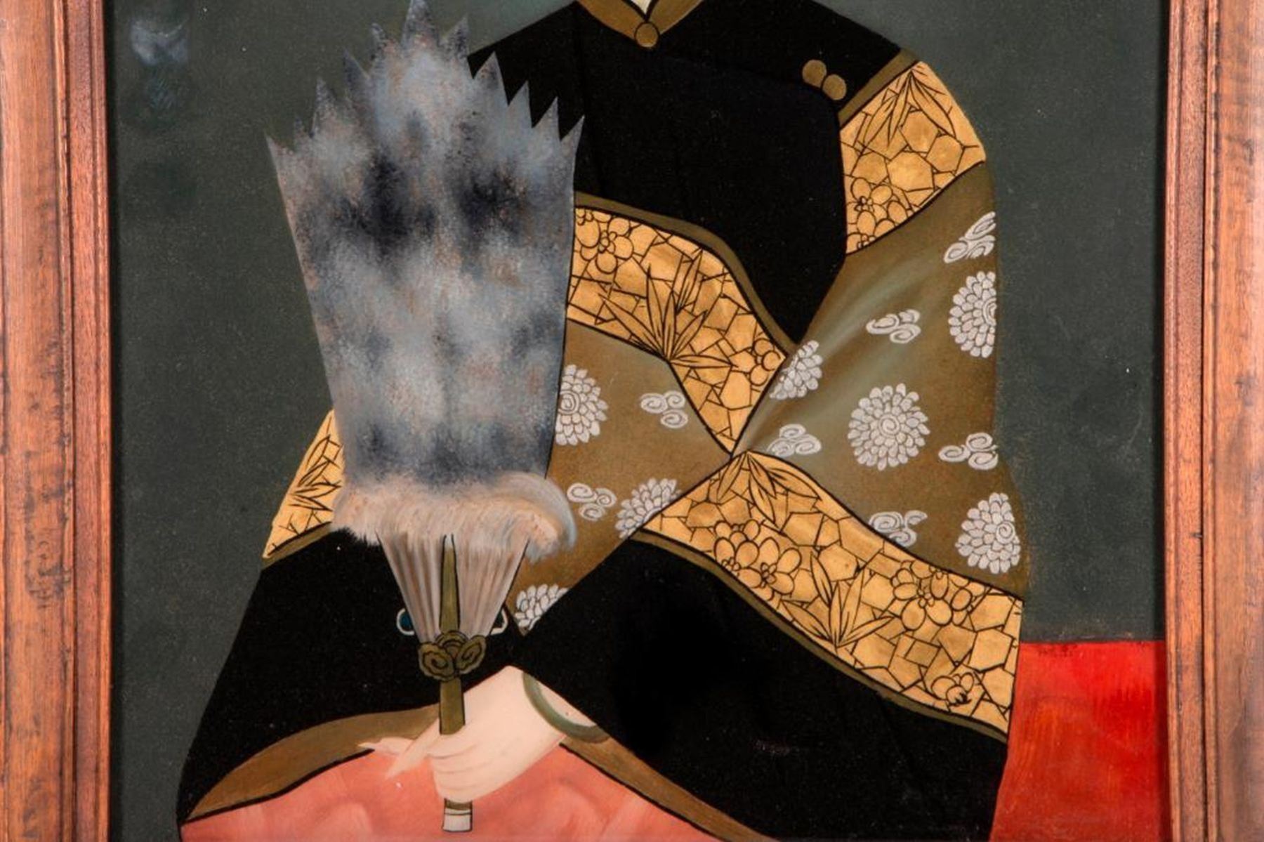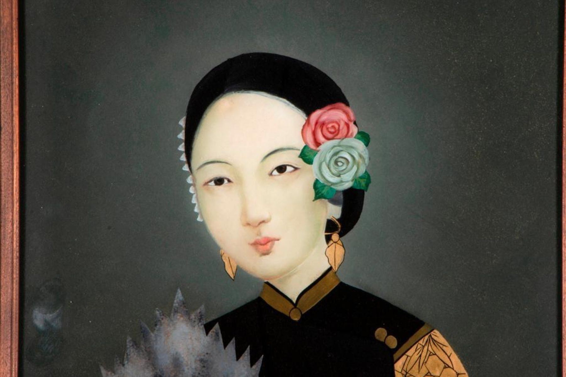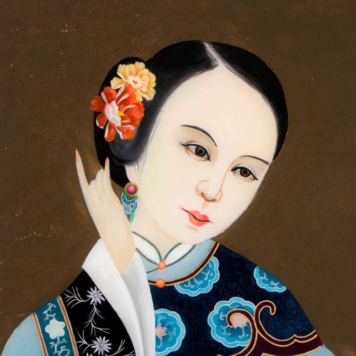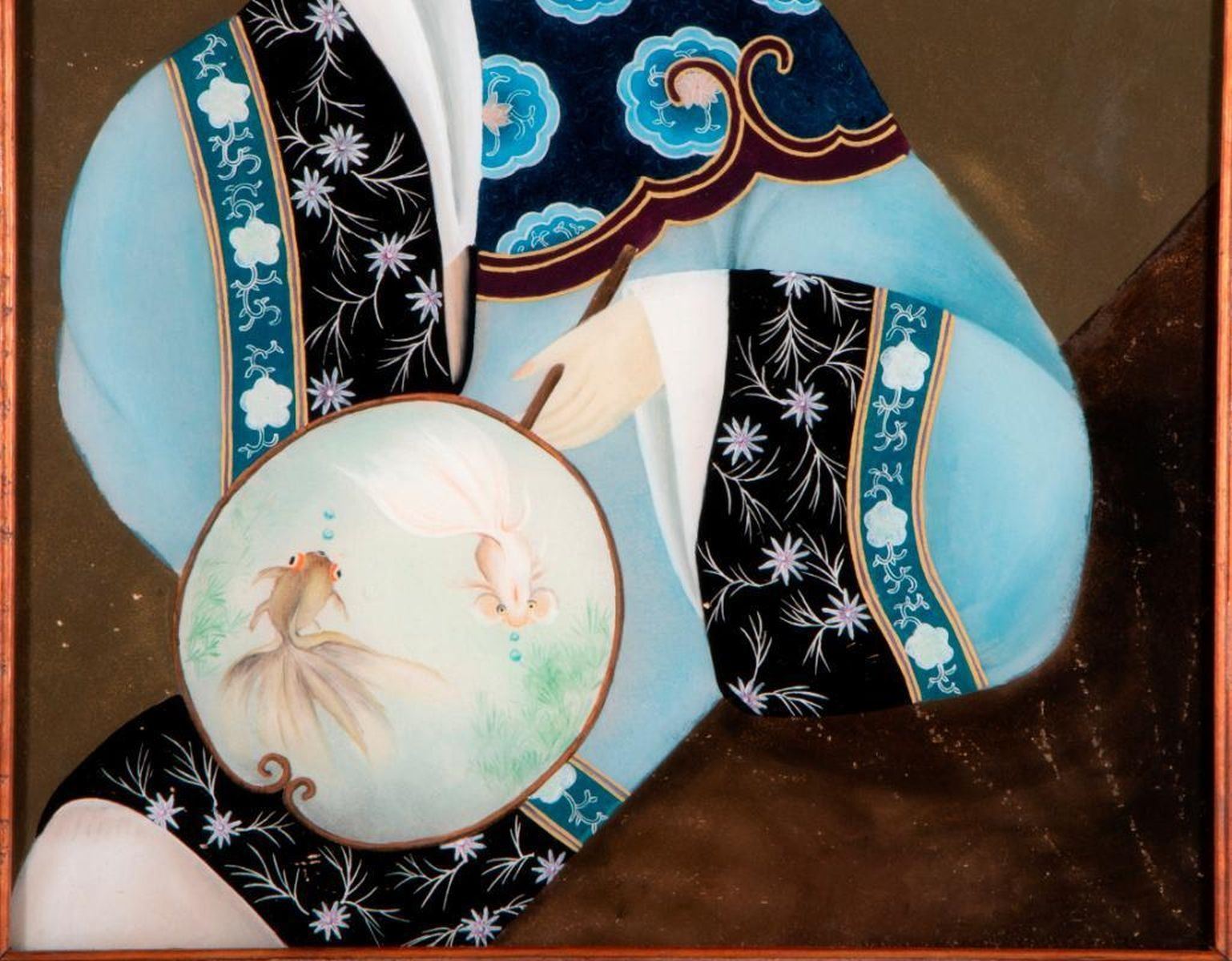 A pair of late 19th / early 20th century Chinese reverse painted glass portraits of maidens measuring each 22 1/2 inches high x 16 1/2.