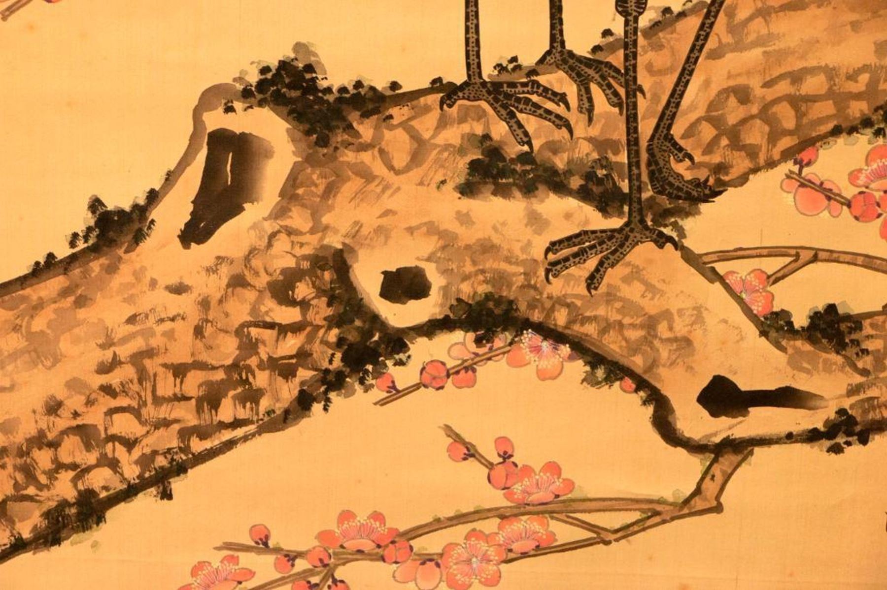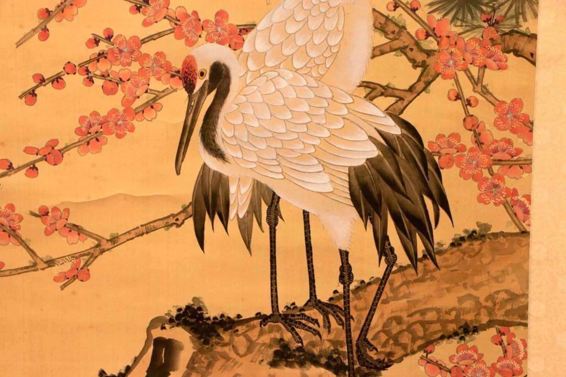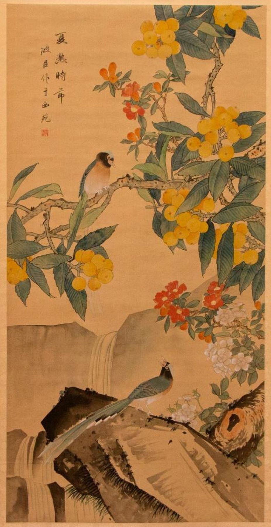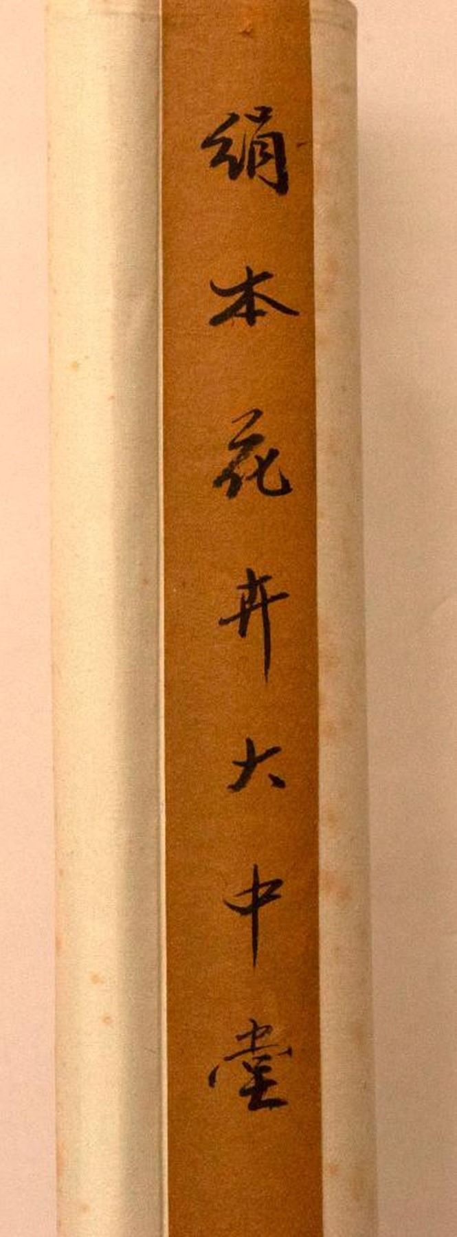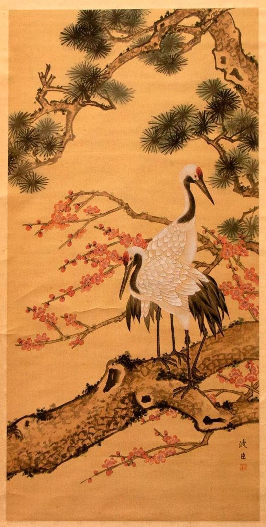 Two painted Chinese scrolls, one depicting Fall and one Winter, each measuring 91 inches high x 32 wide. The first half of the 20th century.