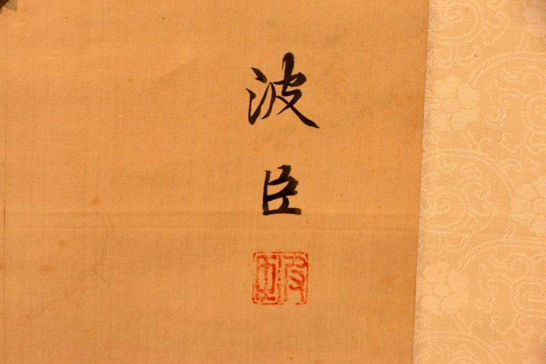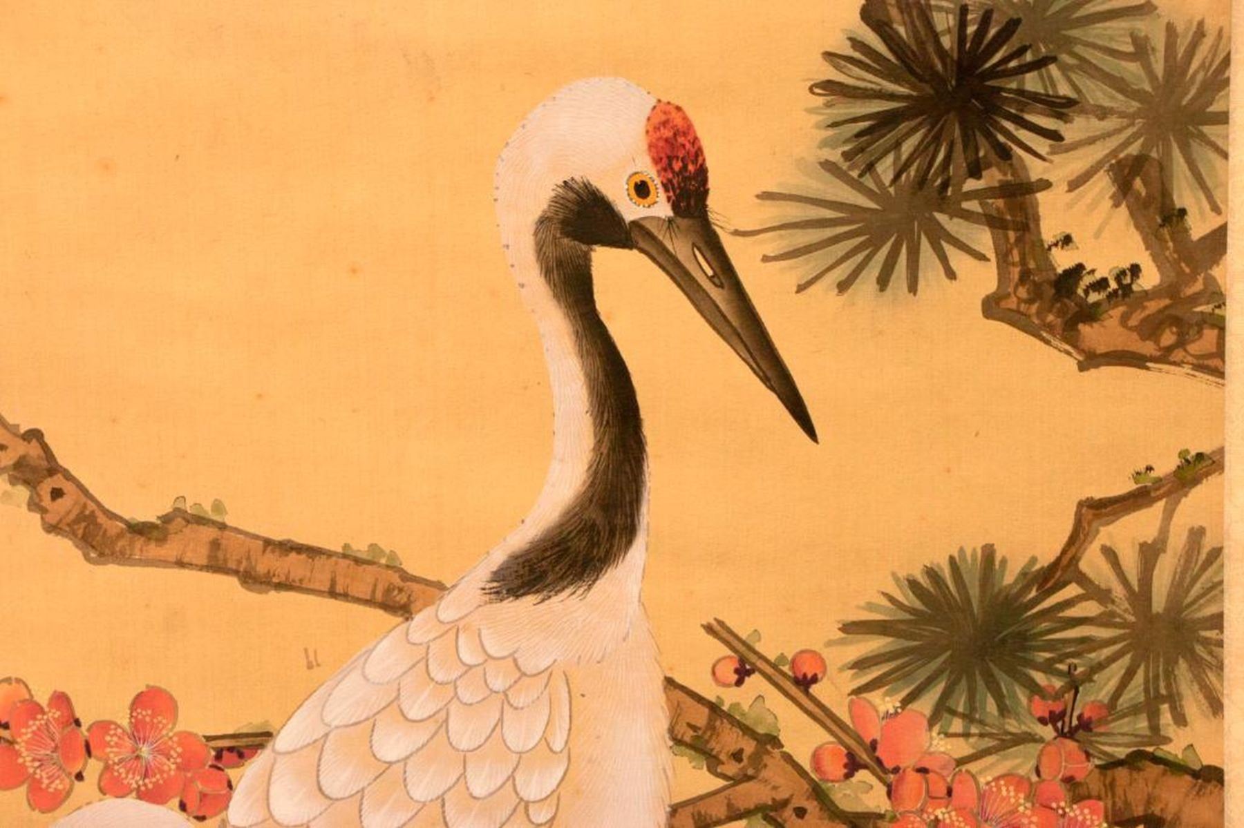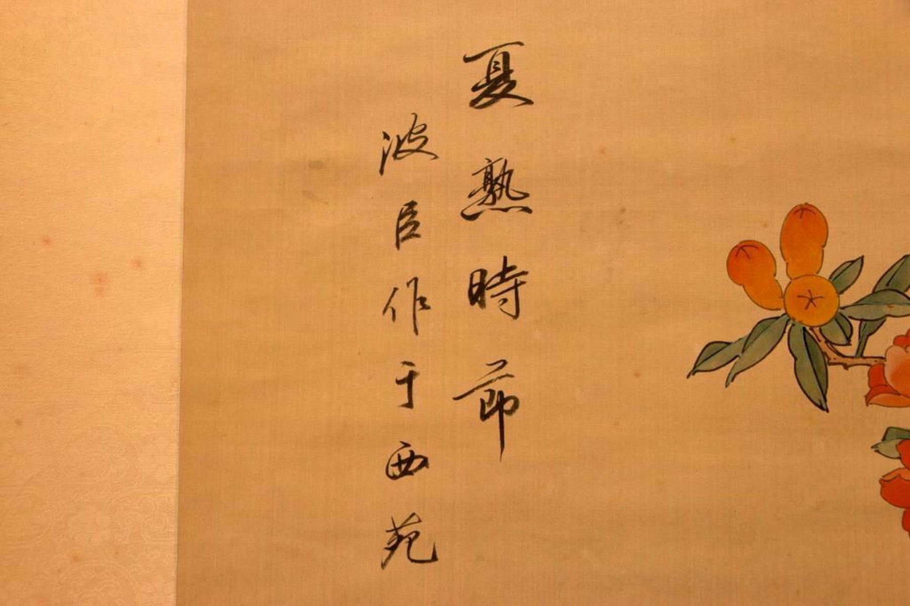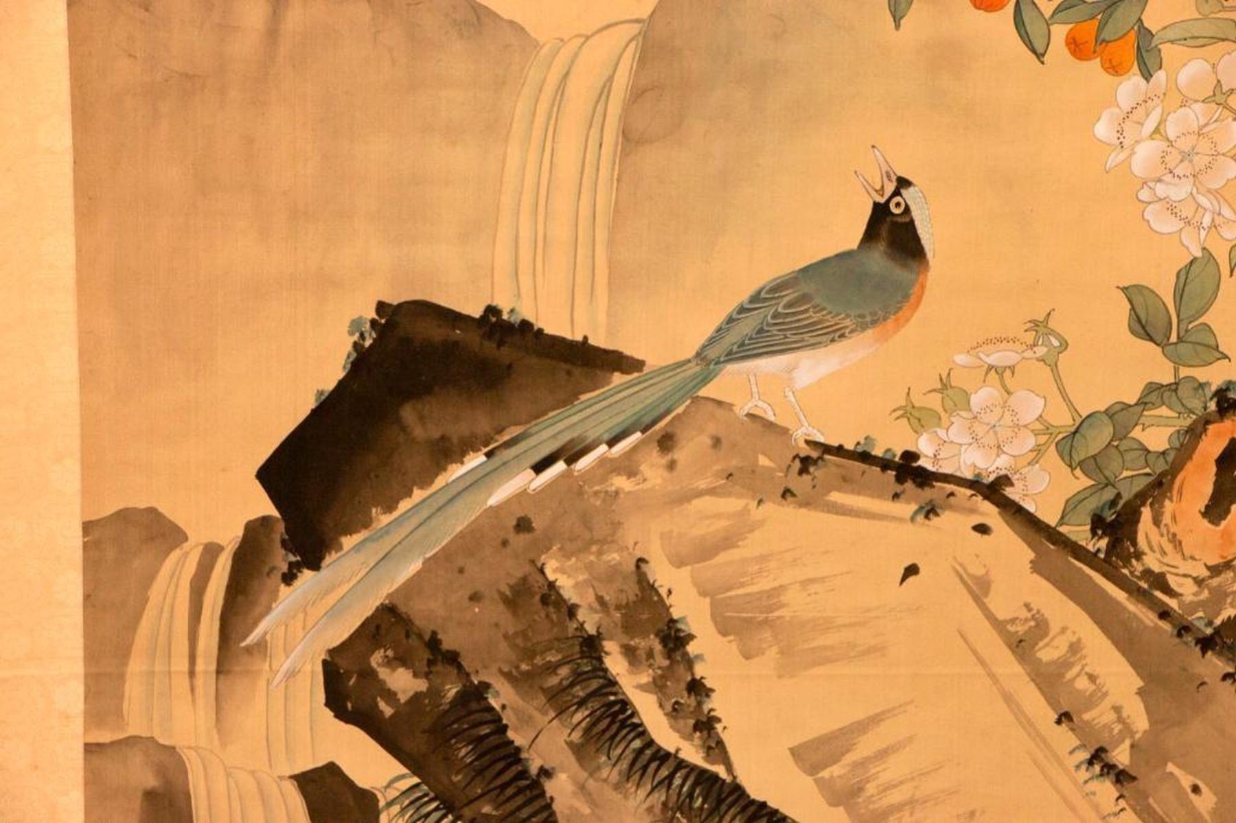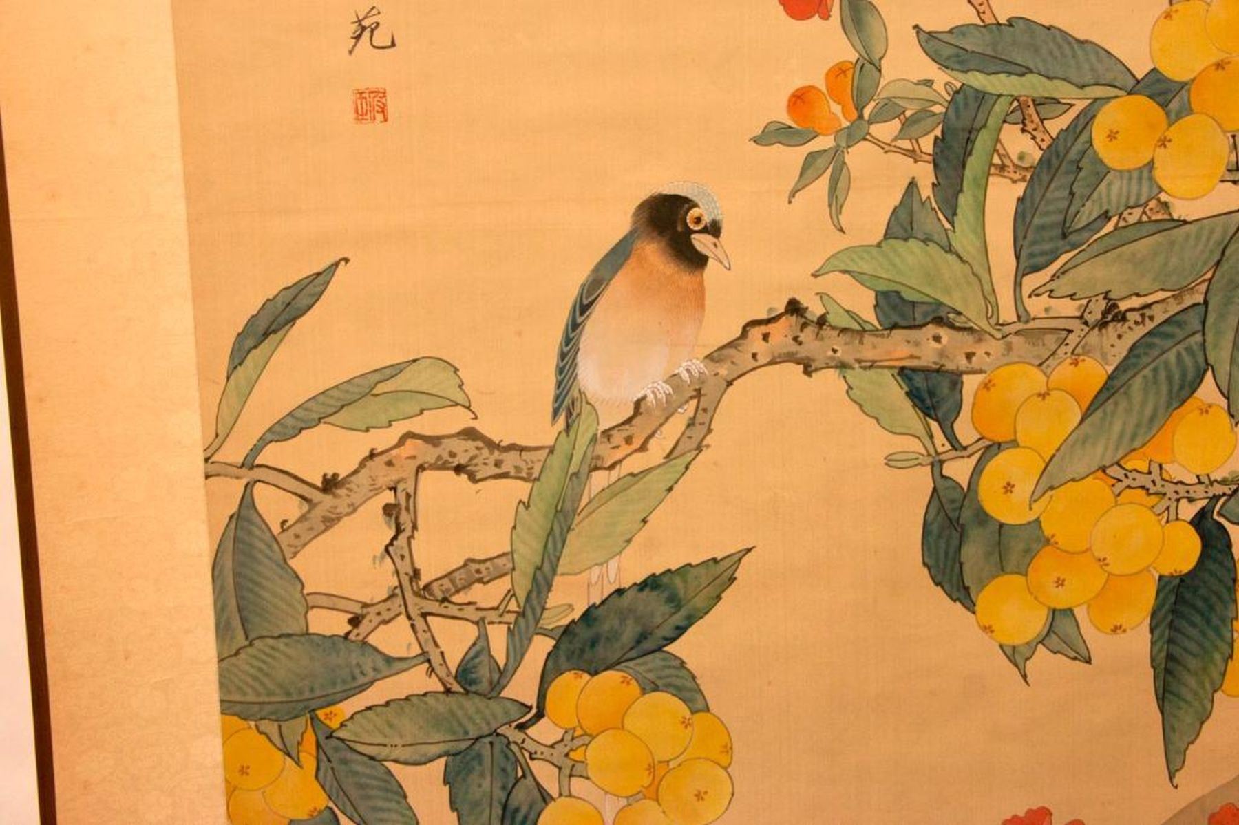 Two painted Chinese scrolls, one depicting Fall and one Winter, each measuring 91 inches high x 32 wide. The first half of the 20th century.