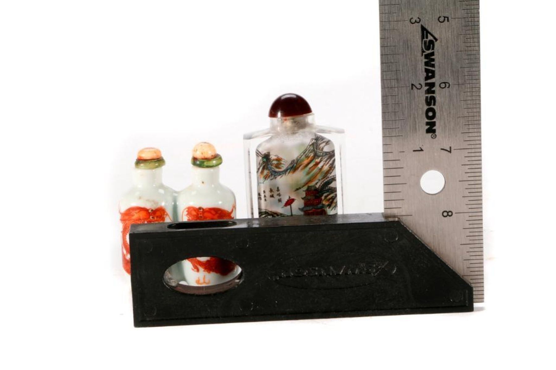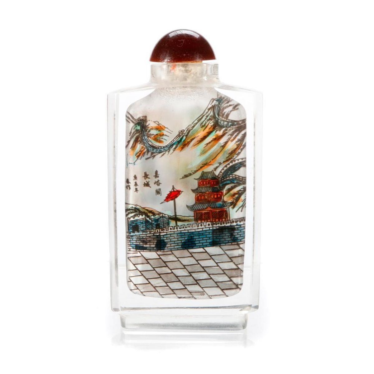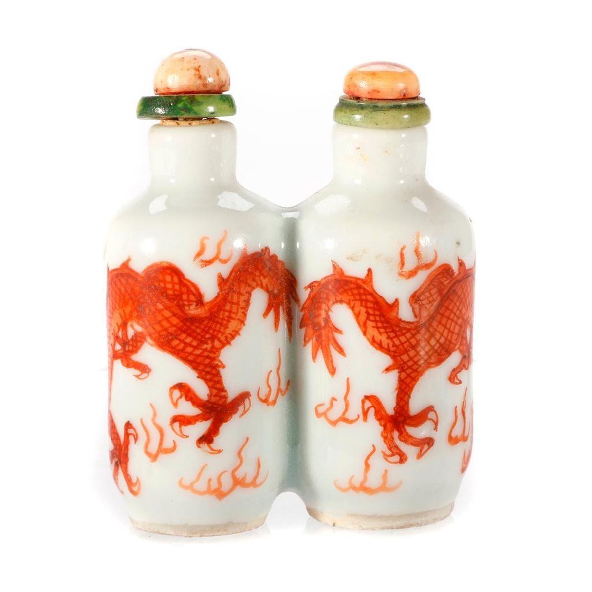 Two Chinese snuff bottles. Reverse painted glass measuring 3 1/4 inches high and a double porcelain measuring 2 1/4 inches high.