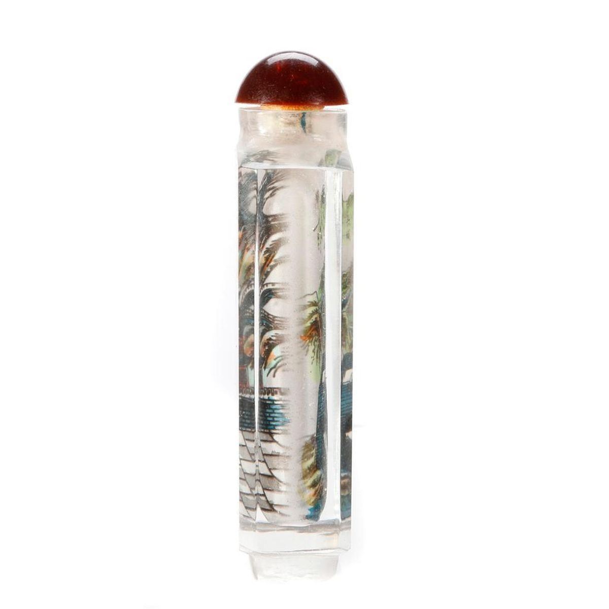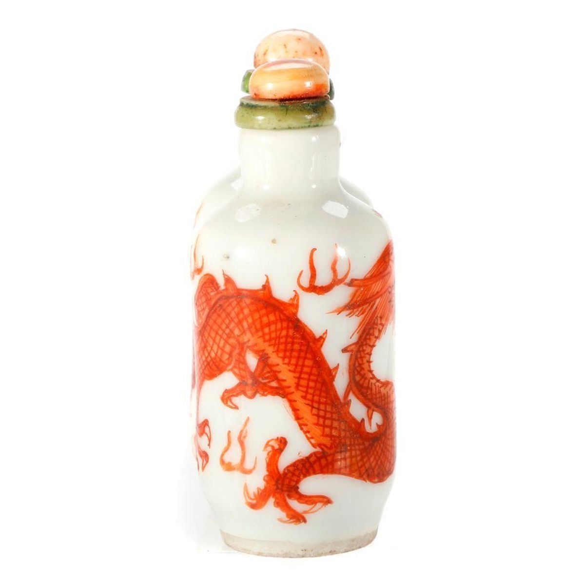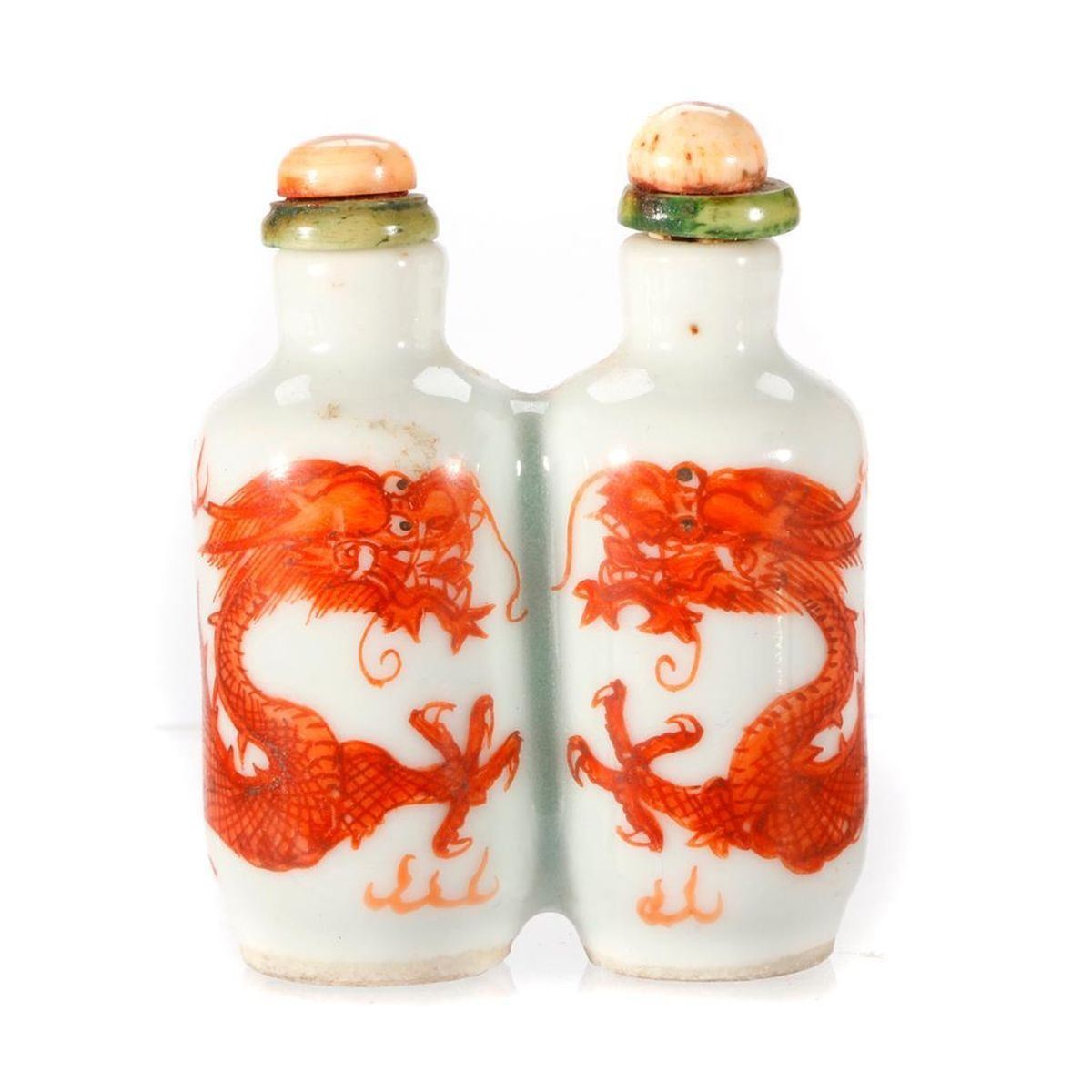 Two Chinese snuff bottles. Reverse painted glass measuring 3 1/4 inches high and a double porcelain measuring 2 1/4 inches high.