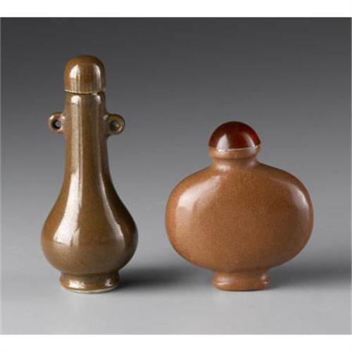 <B>Two Chinese Snuff Bottles<BR></B></I><BR>Two Chinese snuff bottles; "goldstone" of flattened and rounded form, together with ceramic with rust-flecked glaze<BR>Tallest: 3-3/8in. high<BR><BR> <B>Condition Report:</B> Normal signs of wear as appropriate with age.<BR><BR><b>Shipping:</b> Bottles, Jars & Containers (<a target="_blank" href="http://www.heritageauctions.com/common/shipping.php">view shipping information</a>)