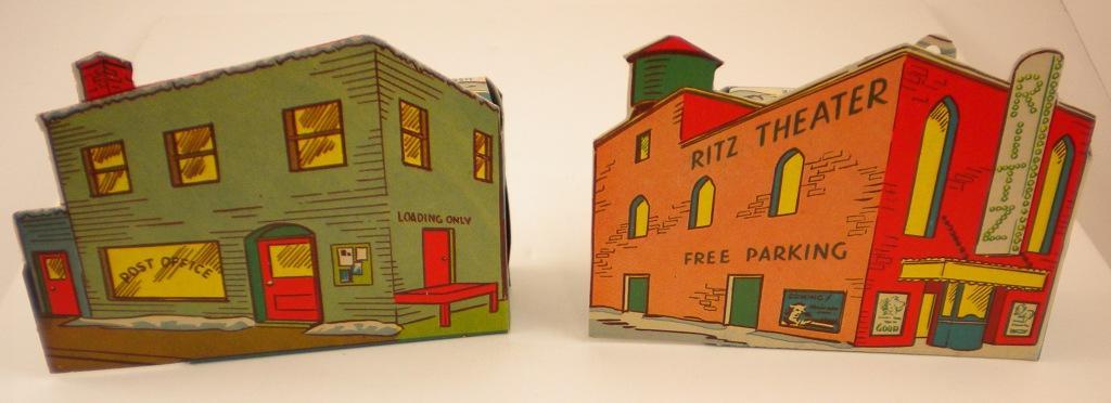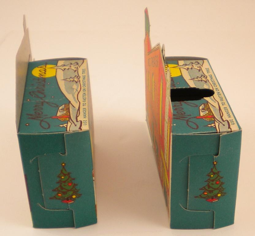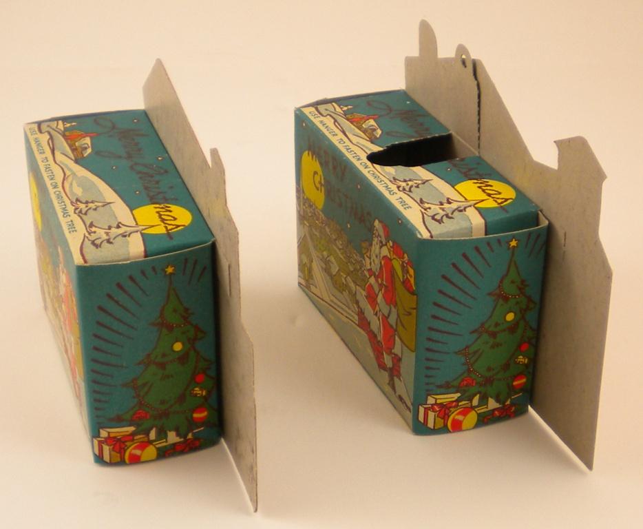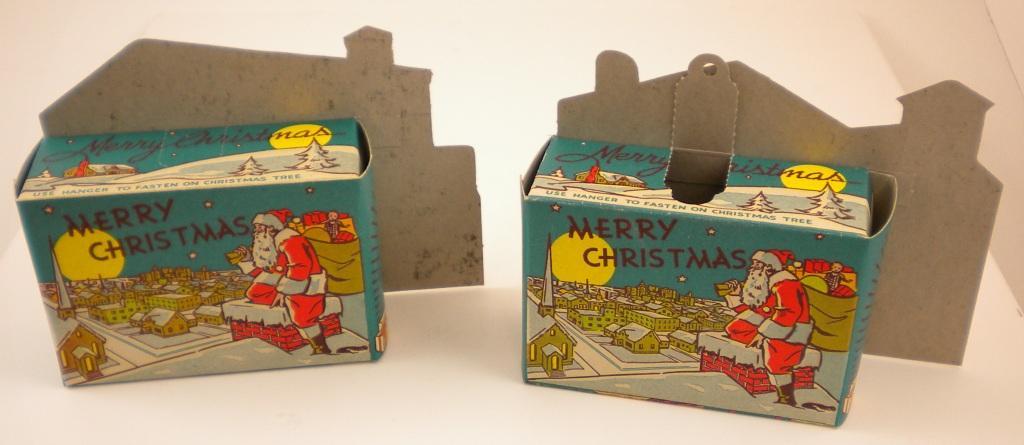 These are in the shape of buildings and could have been used as ornaments on the tree or as free-standing displays. Folded as pictured, they are about 4 1/2 inches tall x 6 inches wide x 1 3/4 inches deep. They will be shipped unfolded and flat.