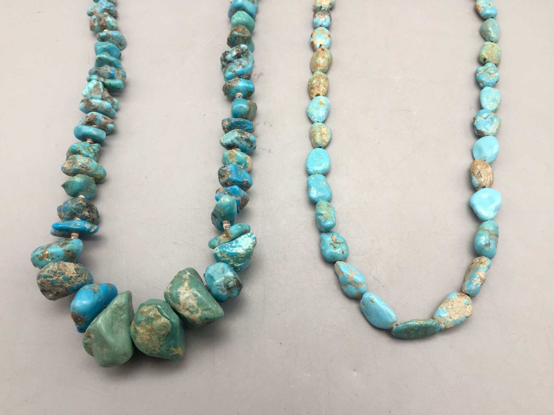Description: Presented for sale in this we have two chunky turquoise necklaces. One necklace has lovely heishi bead accents. Findings are sterling silver. Maker: Various. Approx. Age: Vintage. Size: Various. Combined weight is 147.7 grams. Condition: Good for their ages, normal wear expected. Please look closely at the pictures - they are an important part of our description. Shipping: There will be a $5 handling / packaging fee for shipping this lot. The actual cost of postage will be added on top of that.