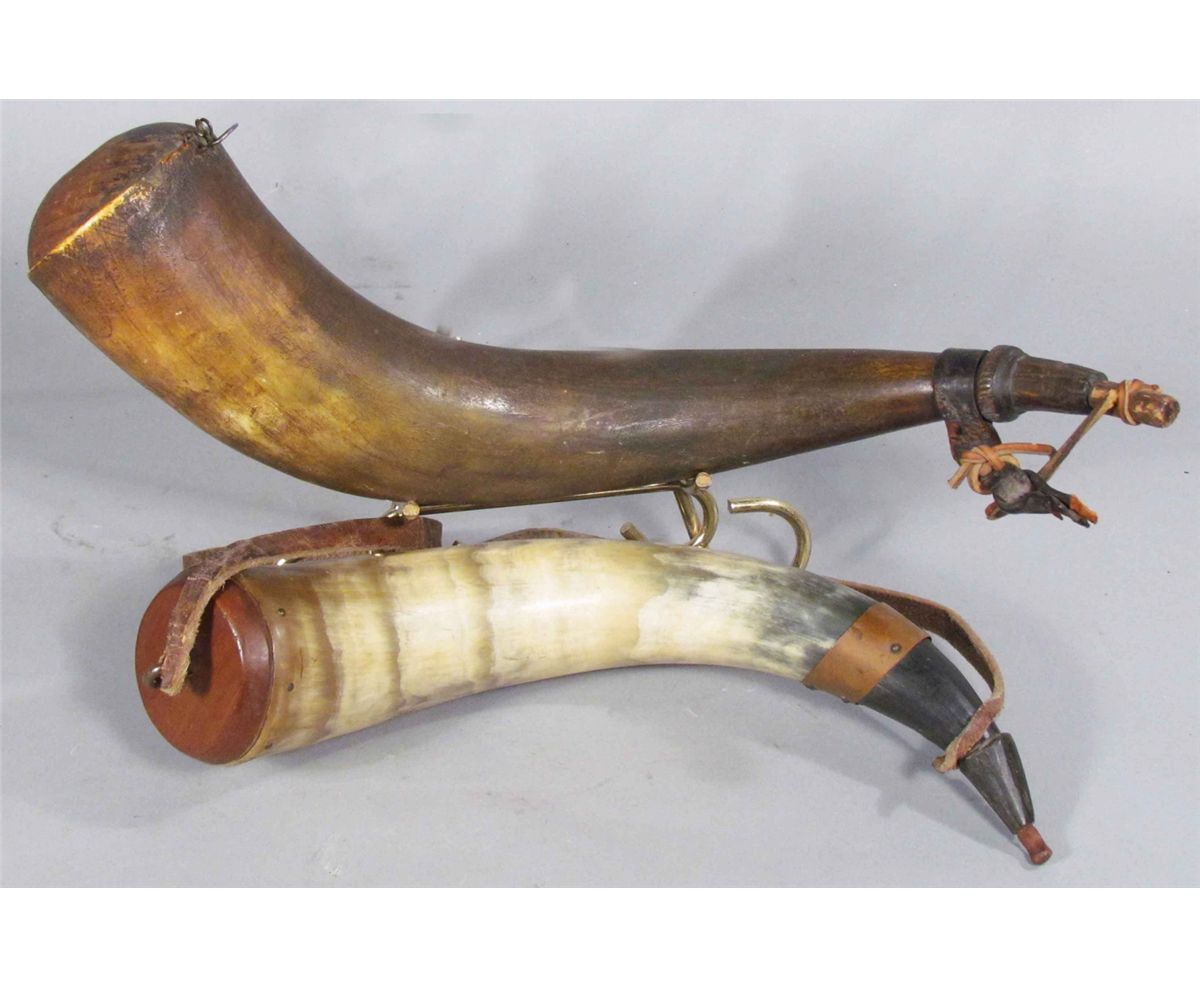 Two Civil War Carved Powder Horns. Largest one has wood stopper and brass brads on top and carved stopper bottom. 16 inches long. Smaller on has wood stoppers at both ends and brass brads and eye ring at top and original shoulder strap. Copper collar at bottom.13 inches long.