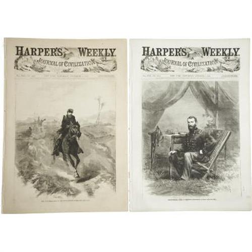 <B>Two Civil War Issues of </B></I><B><I>Harper's Weekly</B></I></B></I><B>,</B></I> approximately 32 pp., folio, New York City, as follows: October 8, 1864 and November 5, 1864, Union Cavalry General Phil Sheridan graces the cover of both issues, one of which depicts his famous ride. Disbound, light aging.<BR><BR><b>Shipping:</b> Flat Material, Large (<a target="_blank" href="http://www.heritageauctions.com/common/shipping.php">view shipping information</a>)