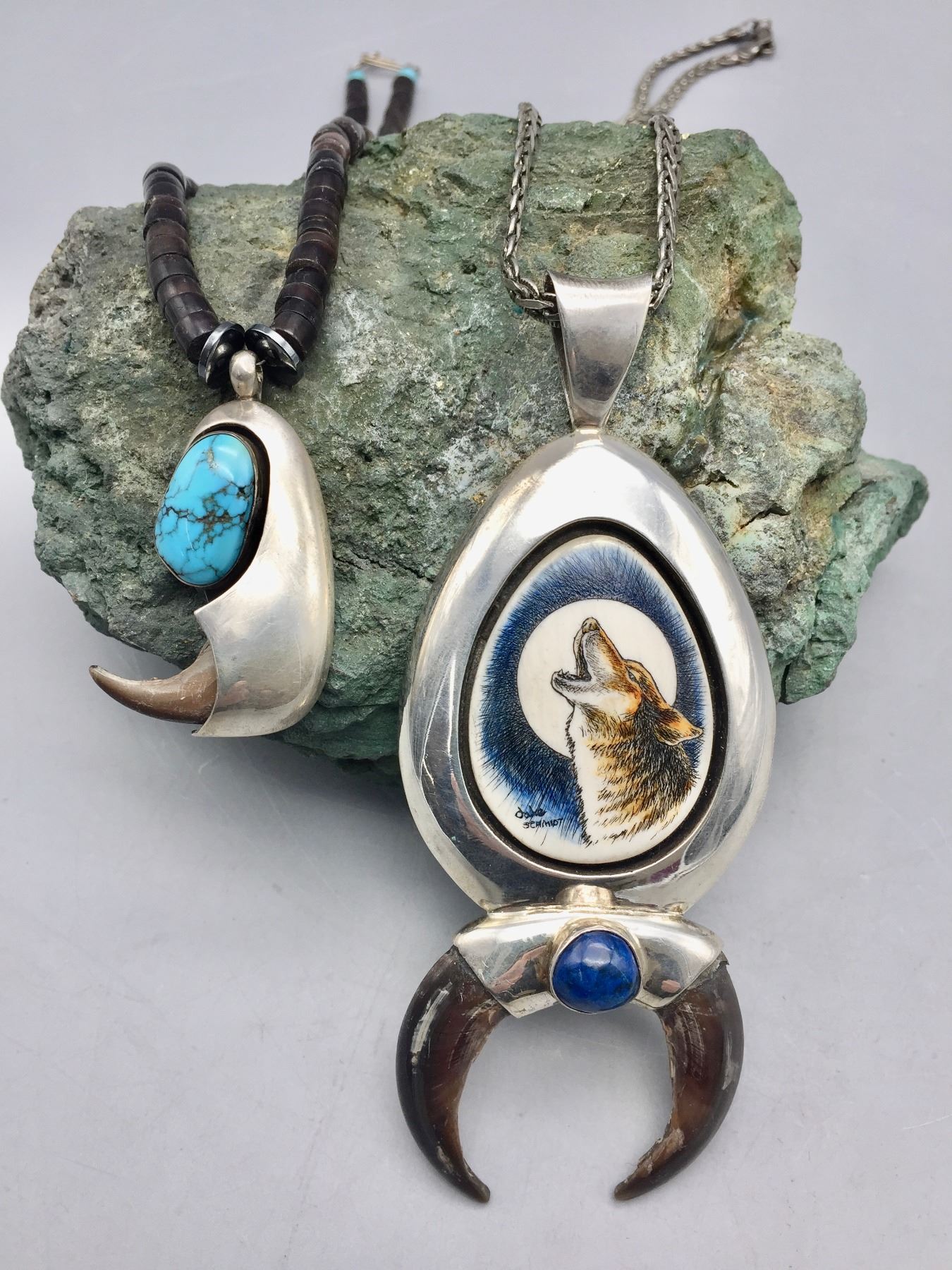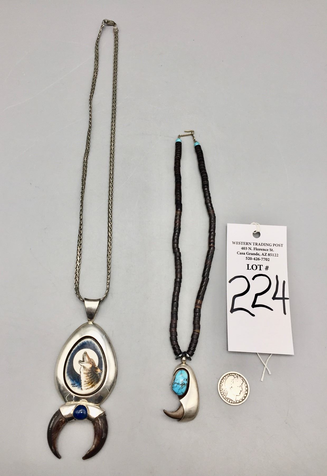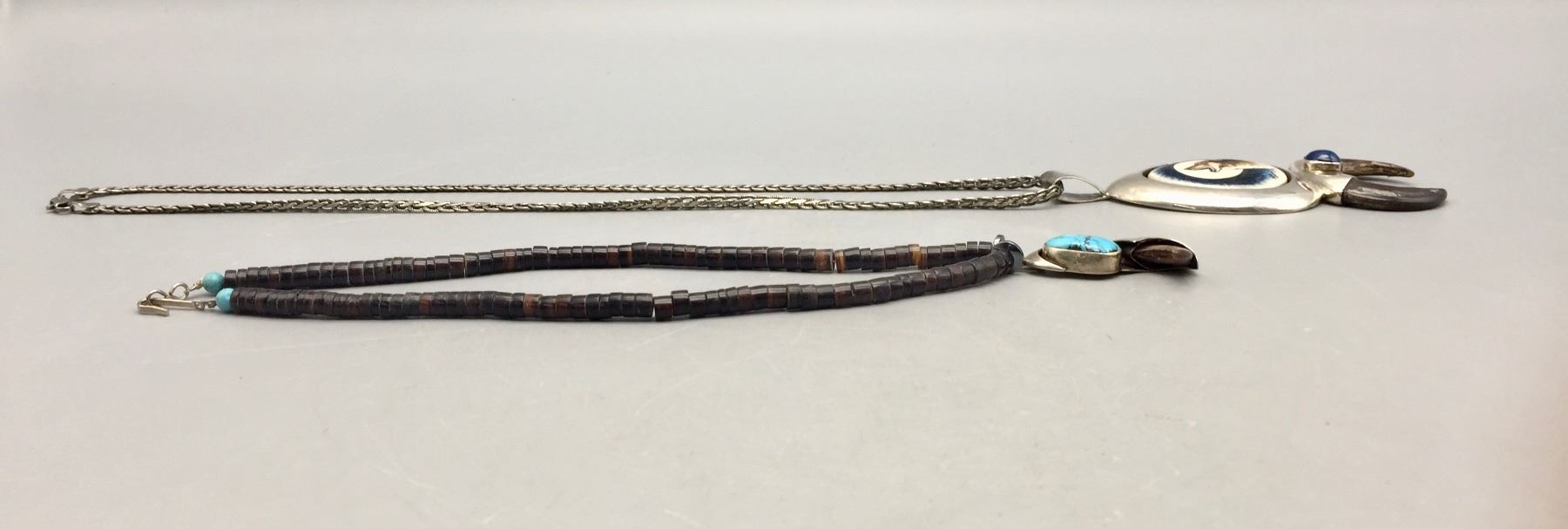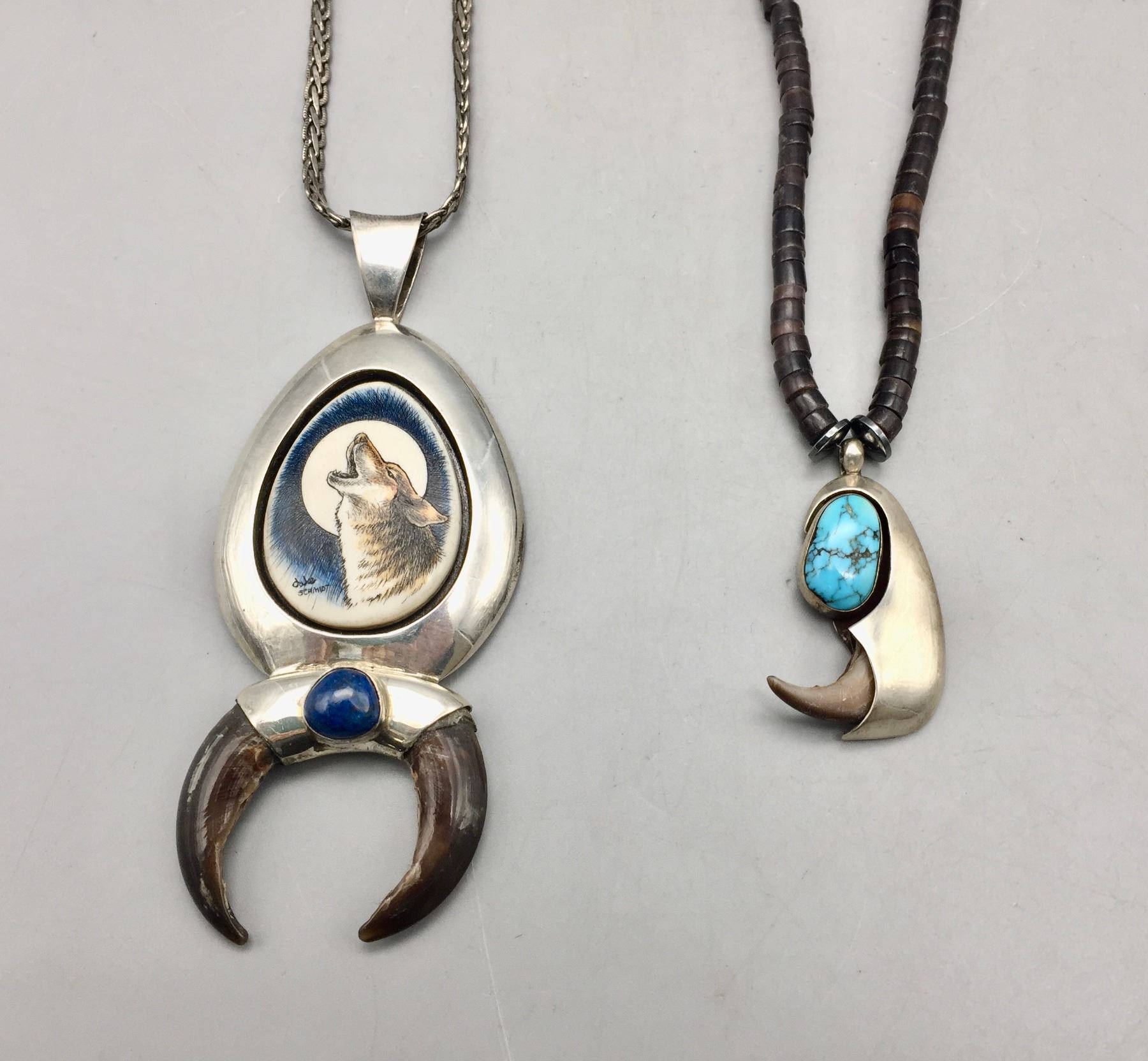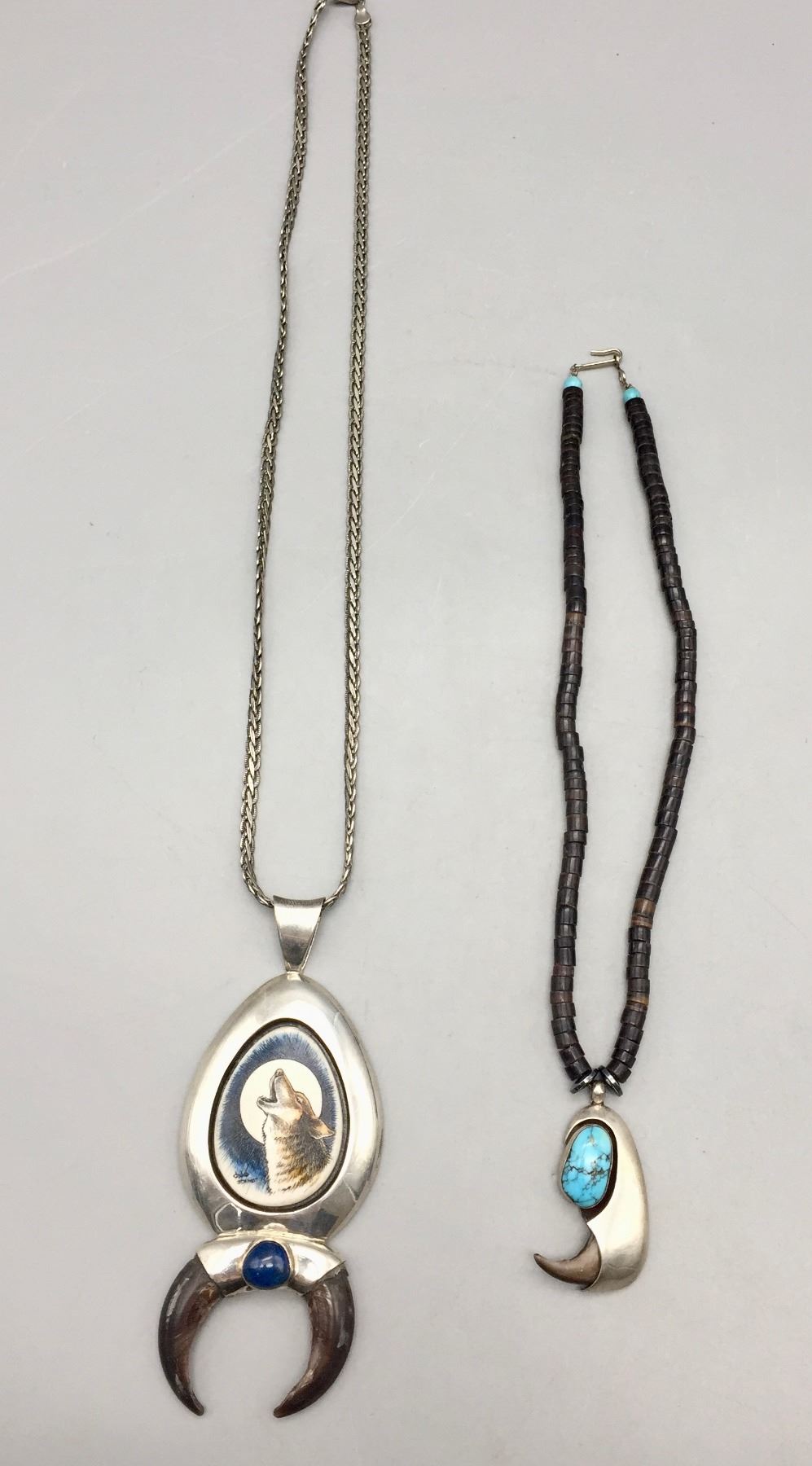 Description: Presented for sale in this lot are two claw necklaces. One features a howling wolf on a silver chain and the other features a single turquoise cabochon on a beaded necklace. Maker: Unknown.