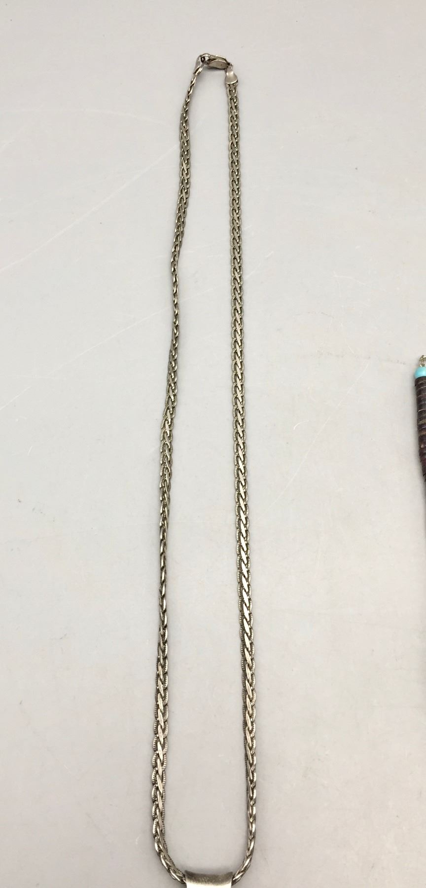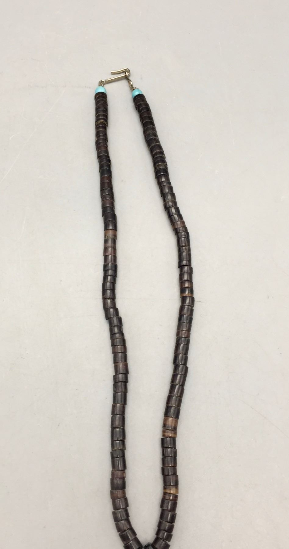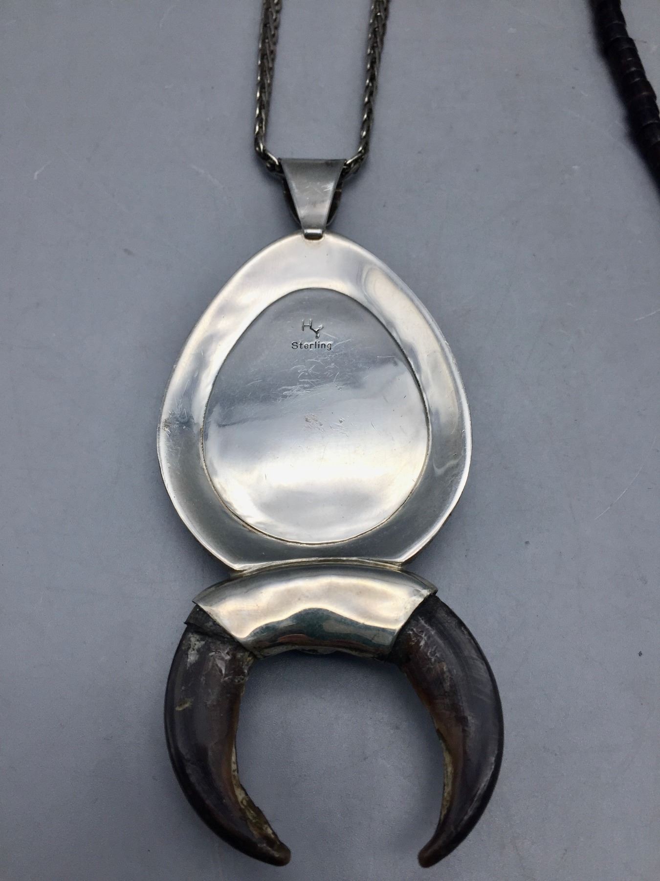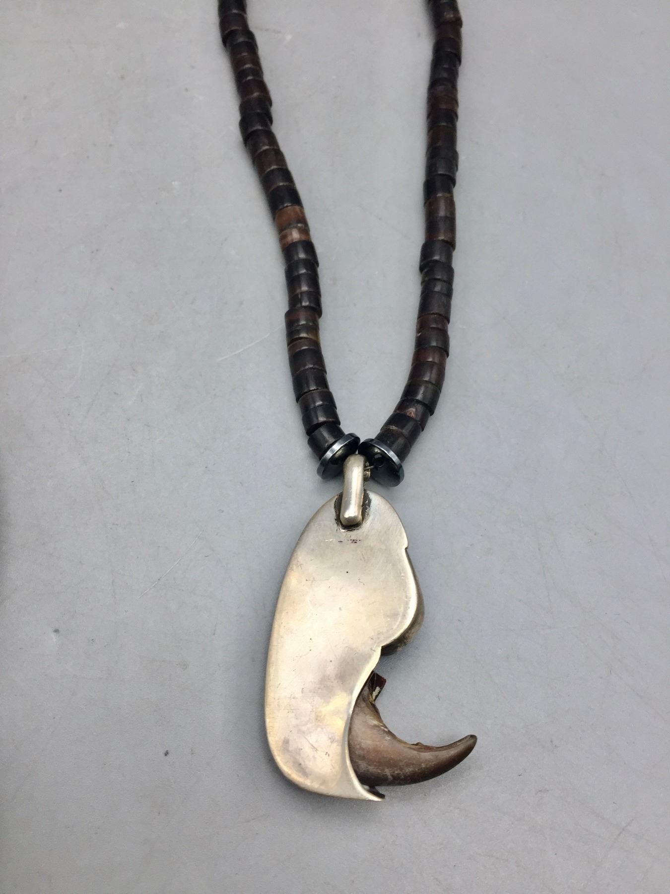 Description: Presented for sale in this lot are two claw necklaces. One features a howling wolf on a silver chain and the other features a single turquoise cabochon on a beaded necklace. Maker: Unknown.