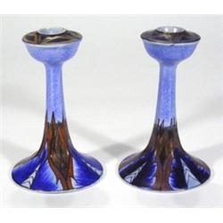Two Clews chameleon ware candlesticks, hand painted with blue and brown flame pattern onto a mottled blue ground, marks to bases, 19cm high