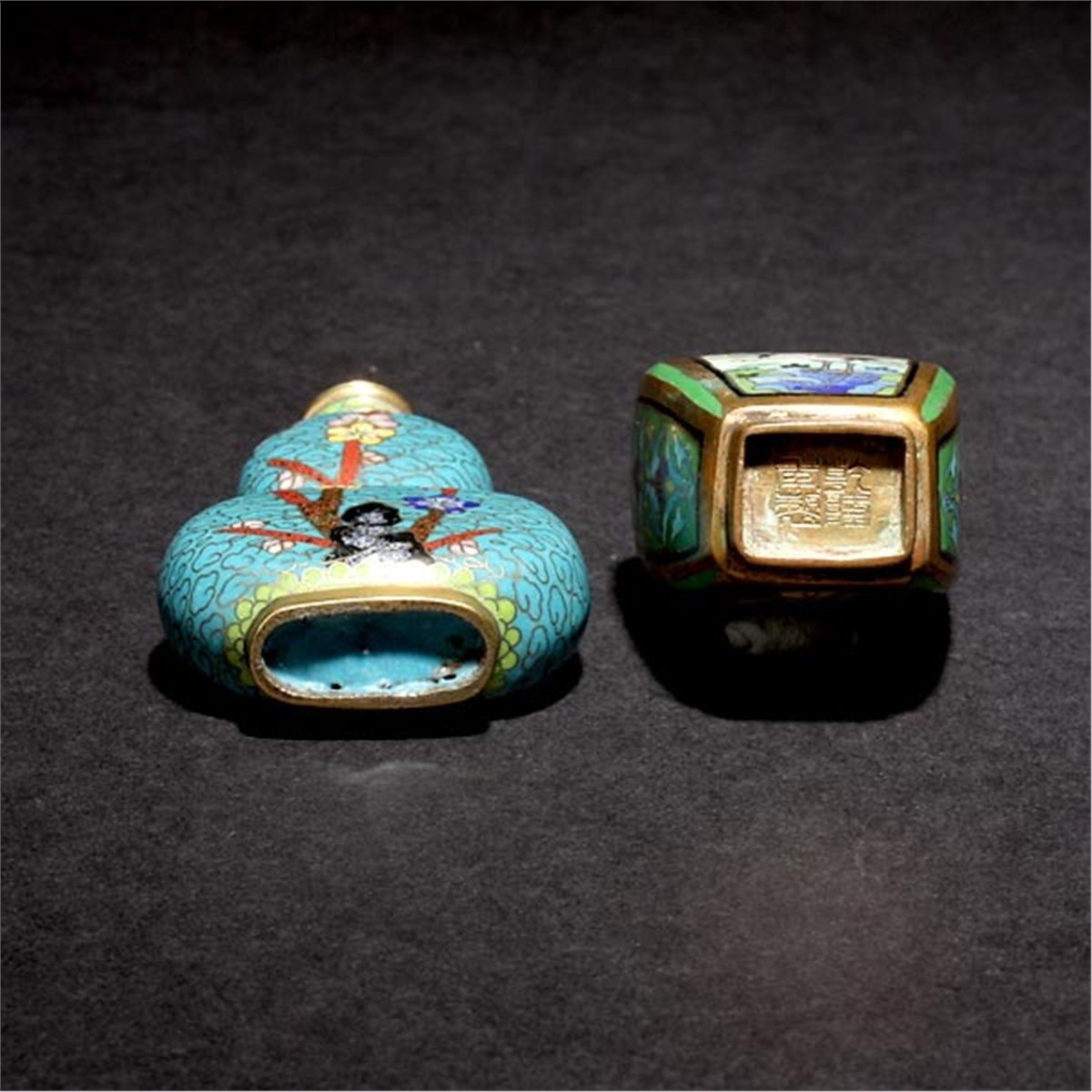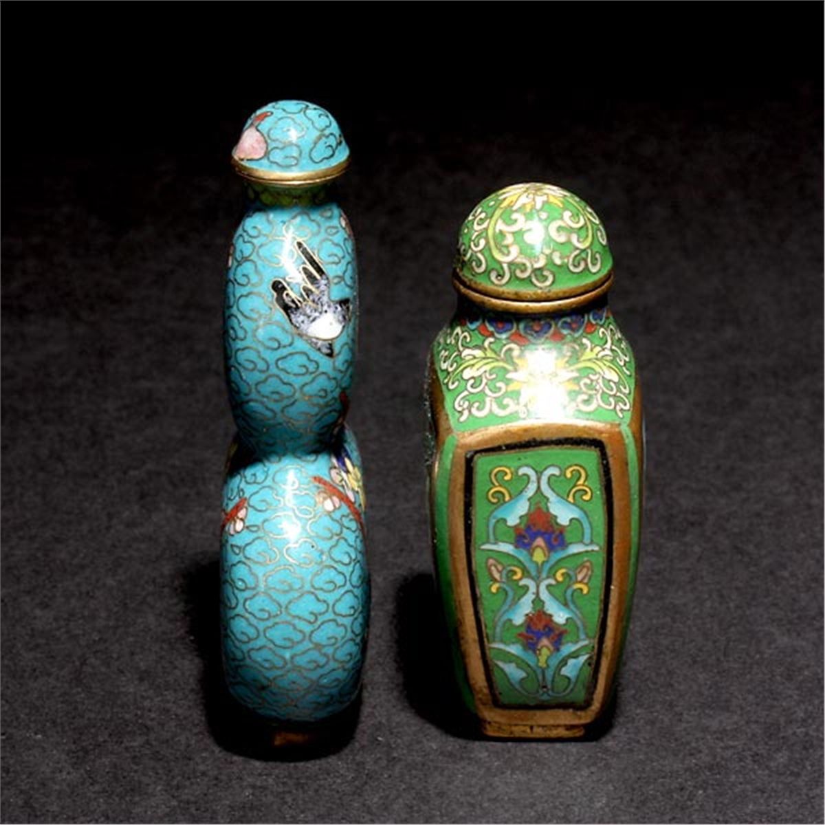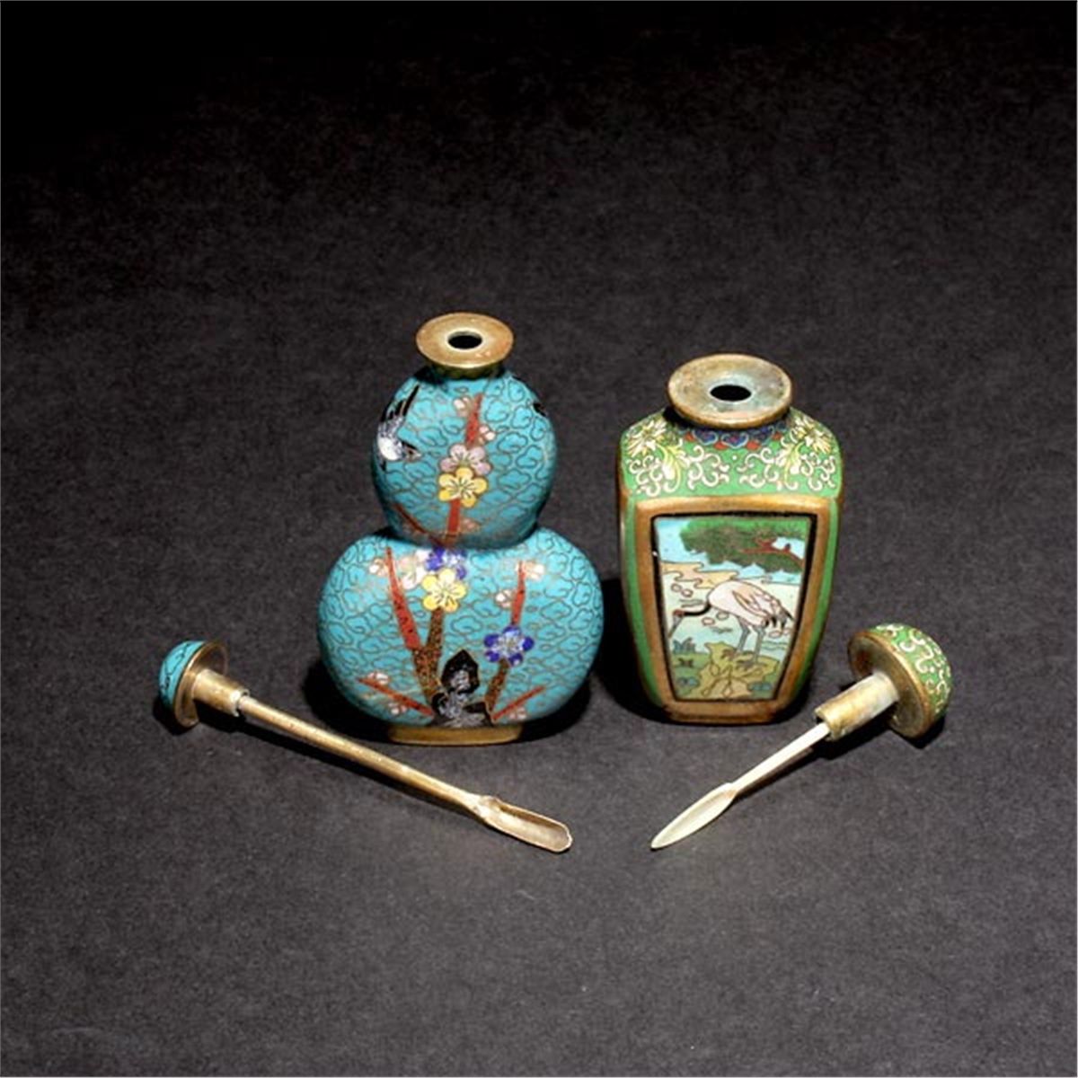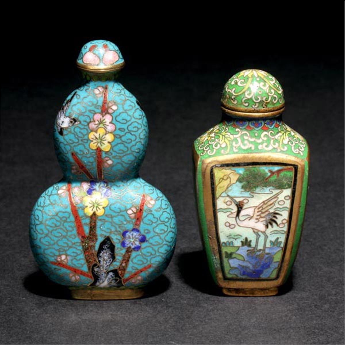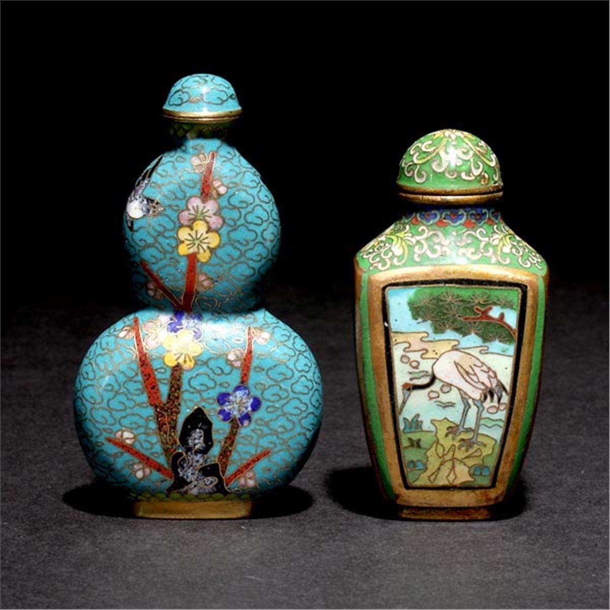 Two Cloisonné-Enameled Snuff Bottles, The first of flattened double gourd form depicting prunus blossoms and birds; the second of square form depicting cranes and stylized sprigs of flowers, the base bearing a four-character Qianlong seal mark. Tallest: 3 inches (7.6 cm) [Wear to gilding. This condition report states major condition issues only.]