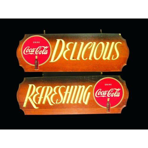 Two Coca Cola Kay Display Signs. Worm wood, excellent original condition. 24 X 8 inches each.
