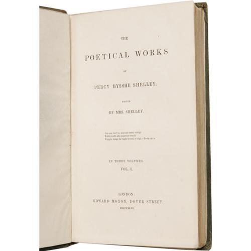 <B>Two Collections of Books Relating to Percy Bysshe Shelley.</B></I> Mary Shelley (Editor): <I>The Poetical Works of Percy Bysshe Shelley</B></I> (London: Edward Moxon, 1847), three volumes, Volume I: 376 pages, Volume II: 432 pages, Volume III: 486 pages, green cloth with gilt lettering on spine, 12mo (4.5" x 7"). 1880 gift inscription on half title page. The set is in good condition, with some sunning to the spines, some wear to the head and tail of each spine, and bumped corners. There is a 2 ½" tear along front edge of spine on Volume III.<BR><BR>Edward Dowden: <I>The Life of Percy Bysshe Shelley.</B></I> (London: Kegan Paul, Trench & Co., 1886), first edition, two volumes, Volume I: 554 pages, Volume II: 586 pages with index, half-leather and brown decorative boards with marbled endpapers and textblock edges, 8vo (6" x 8.75"). The set is in good condition, with scratched leather on the spines, some edge wear, and bumped corners. <I>From the Betty Bennett Collection.</B></I><BR><BR><b>Shipping:</b> Books & Catalogs (<a target="_blank" href="http://www.heritageauctions.com/common/shipping.php">view shipping information</a>)