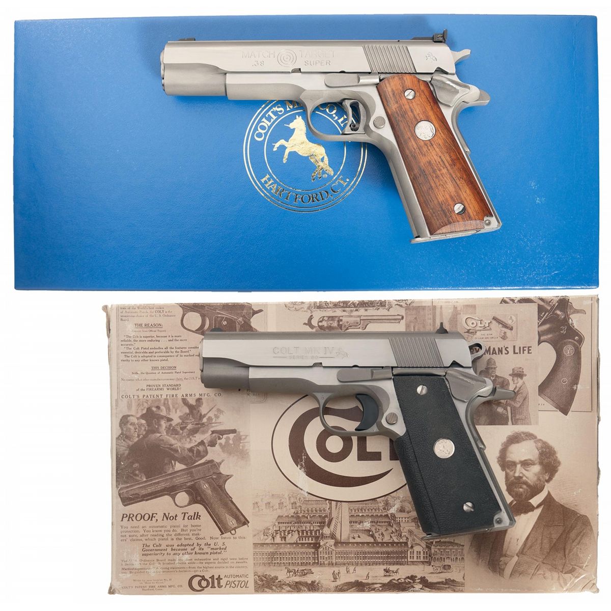A) Series 80 Gold Cup pistol equipped with fixed front sight, Elliason rear sight, adjustable trigger stop, and walnut grips with silver Colt medallions. The pistol has the standard markings of the Gold Cup model. Complete with a factory box and shipping box numbered to the gun.