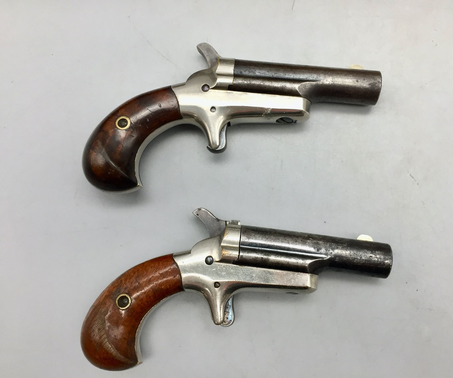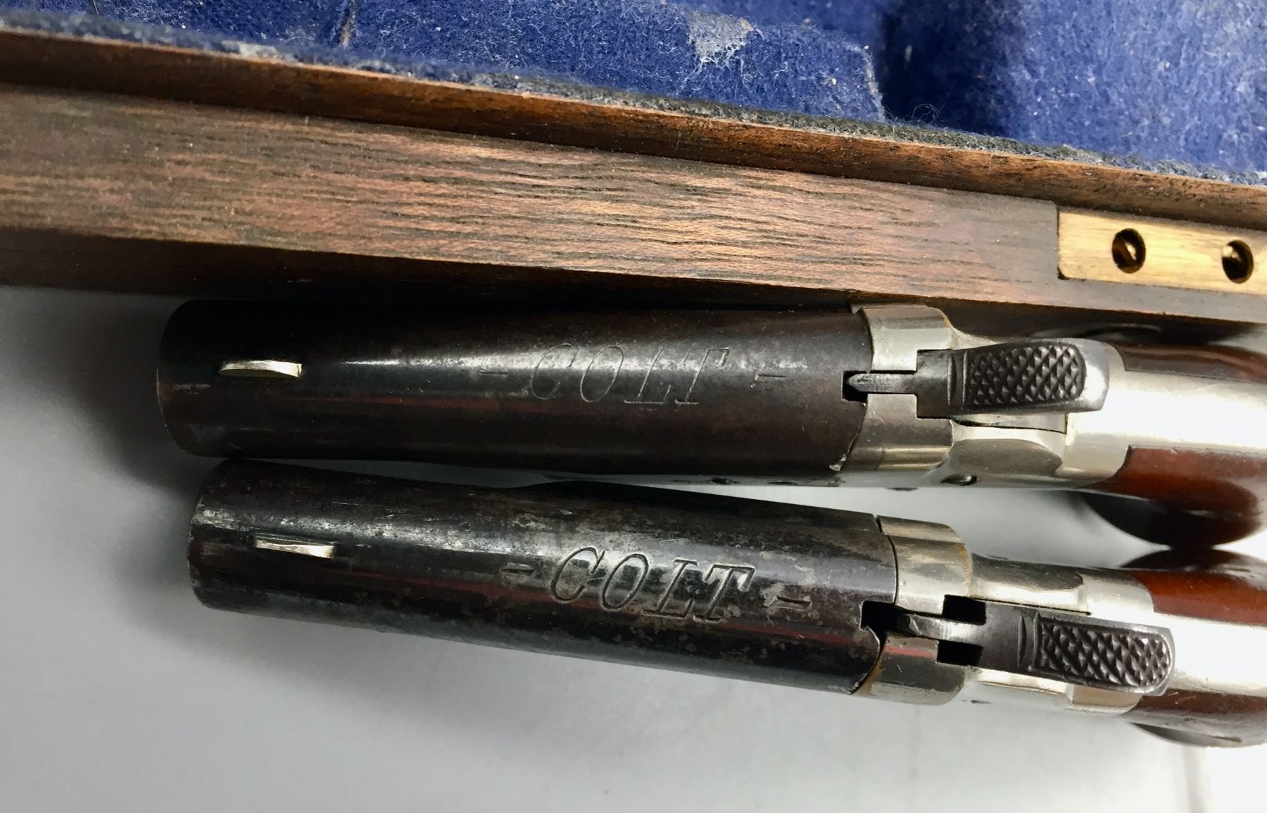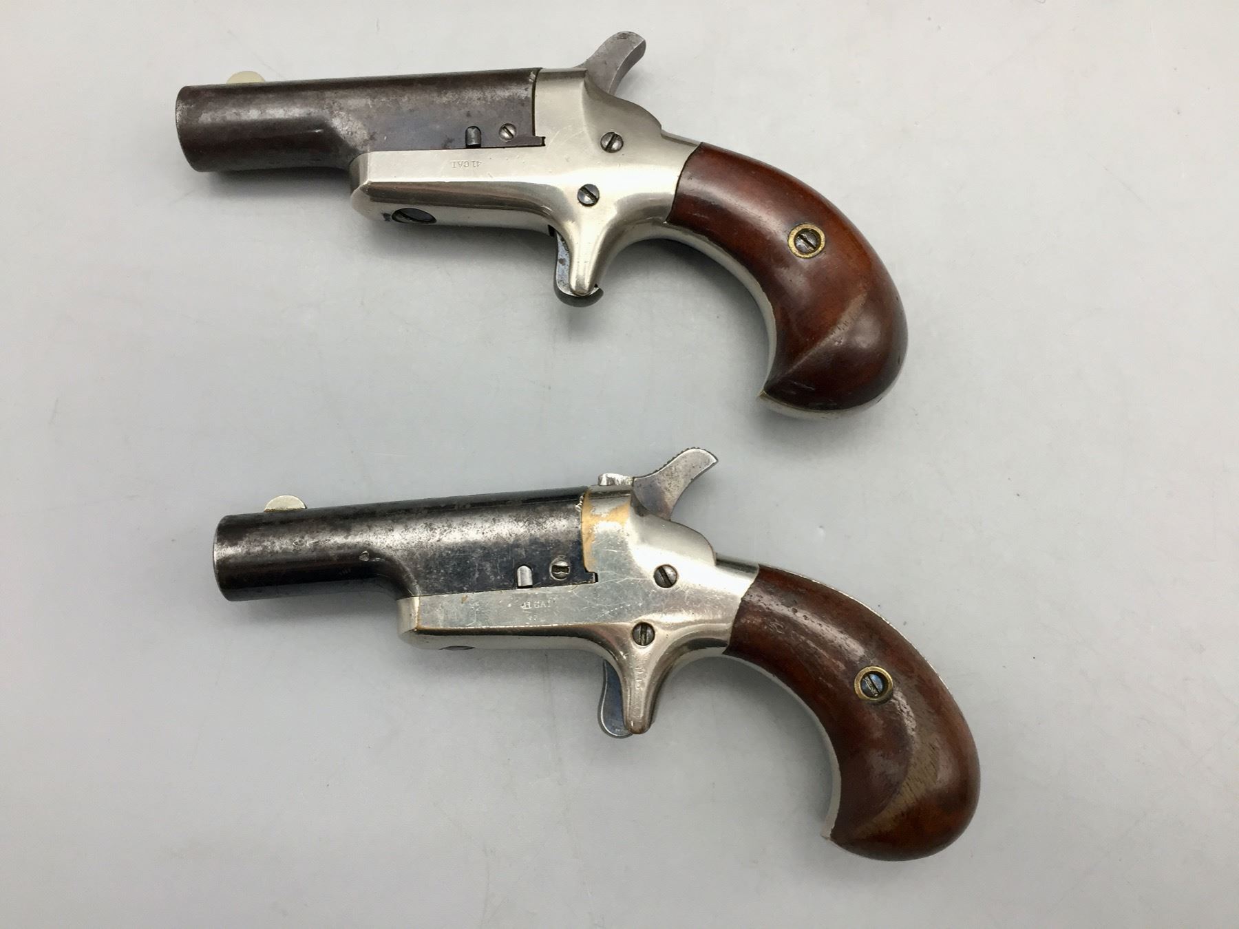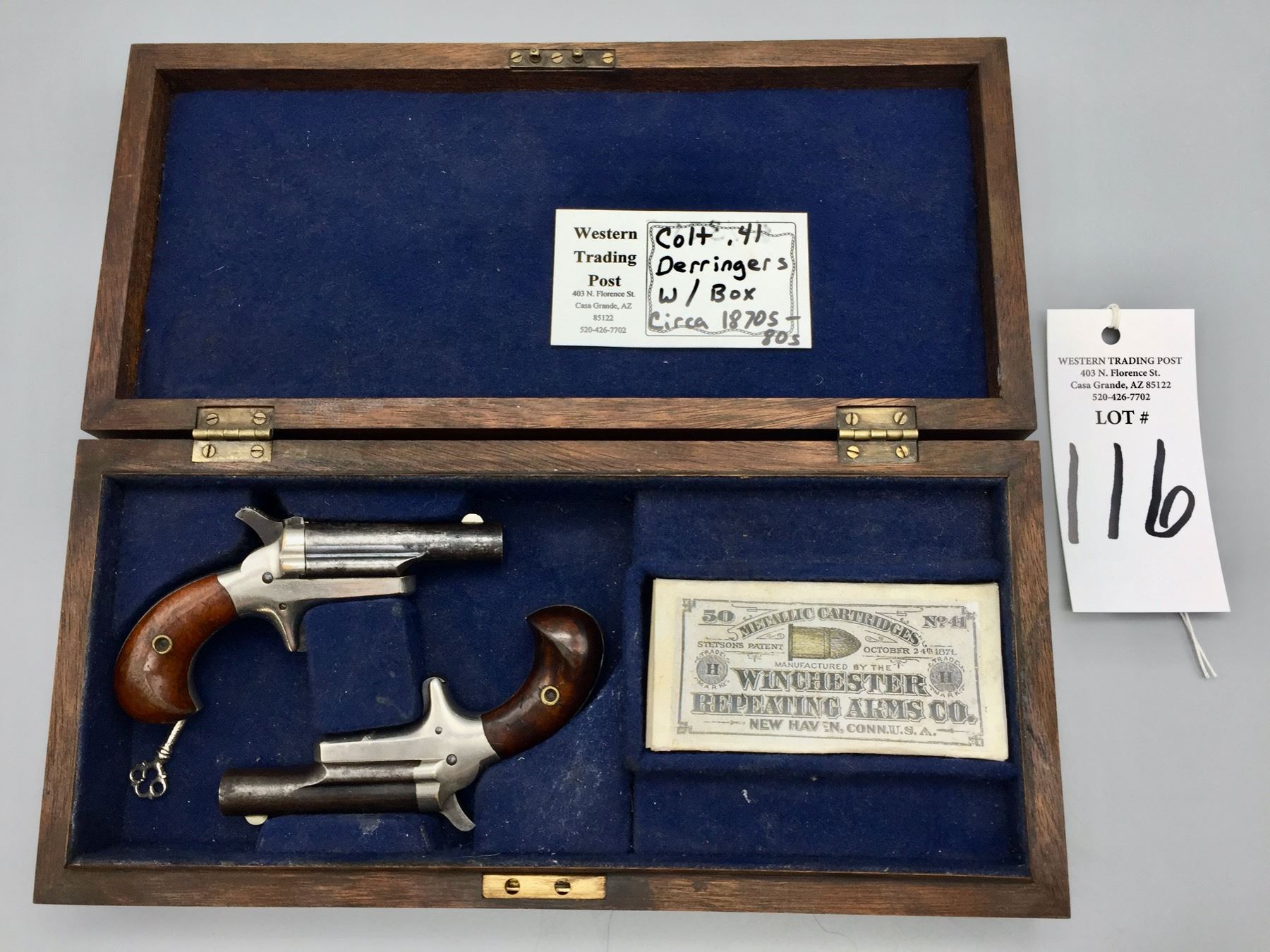 Description: Offered for sale in this lot are two Colt .41 caliber Derringers from circa 1870s - 1880s. They come in a nice presentation box which is modern made. Maker: Colt. Approx. Age: Circa 1870s - 1880s. Size: Barrel measures 2-1/2” with an overall length of 5-3/8”. Condition: Pretty good for its age, normal wear expected. Everything appears to function correctly. Please look closely at the pictures - they are an important part of our description. Shipping: There will be a $15 handling / packaging fee for shipping this lot. The actual cost of postage will be added on top of that. *****ANTIQUE - This firearm DOES NOT REQUIRE an FFL Transfer*****