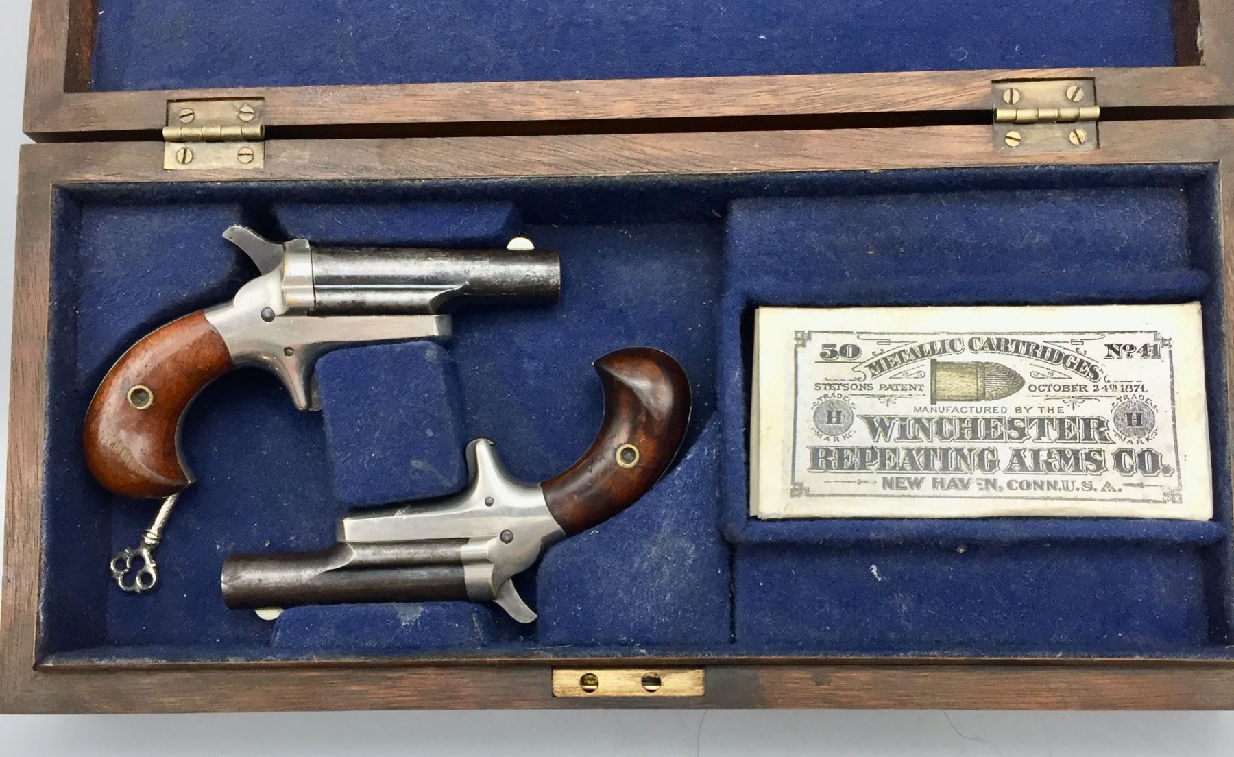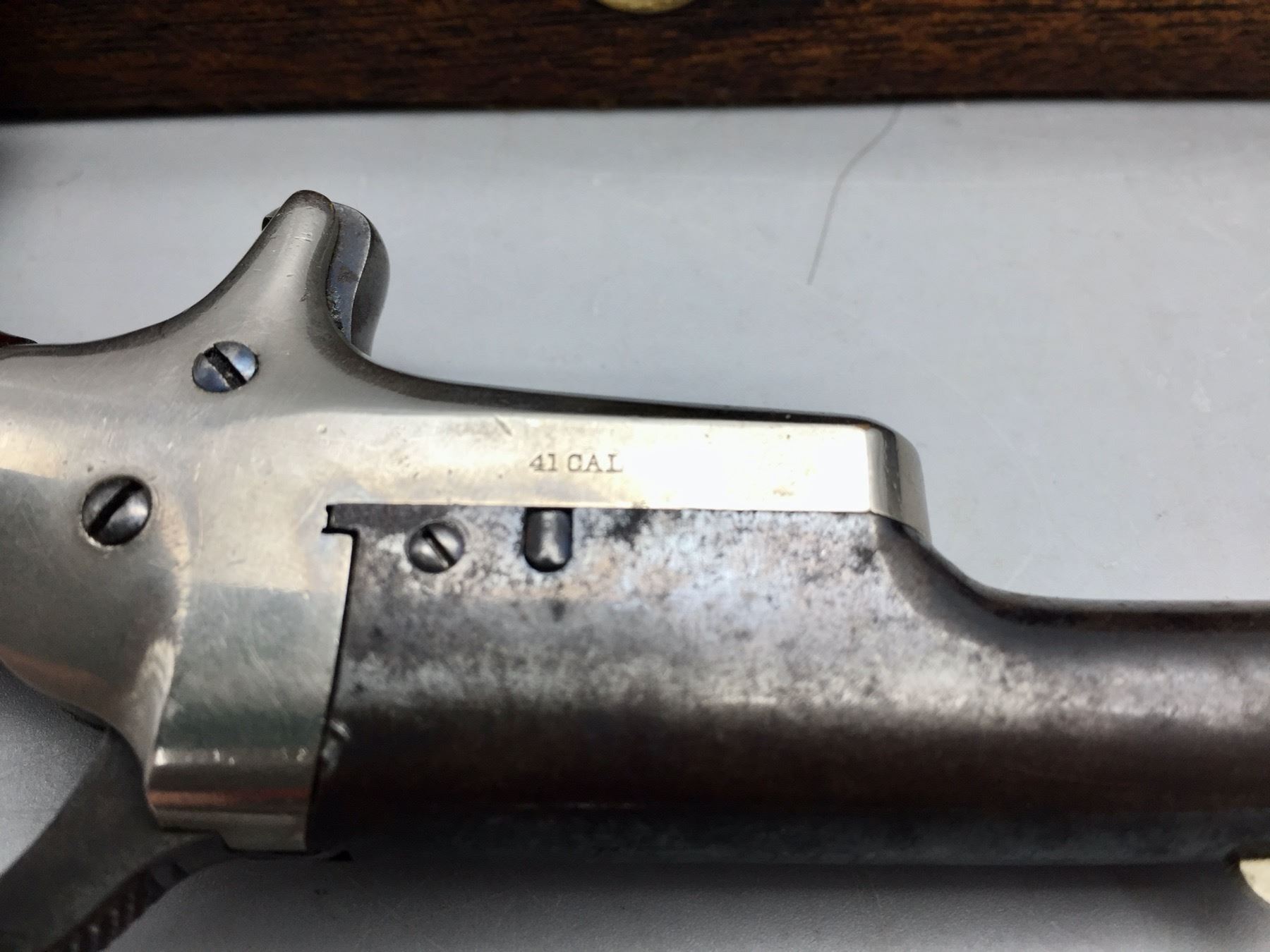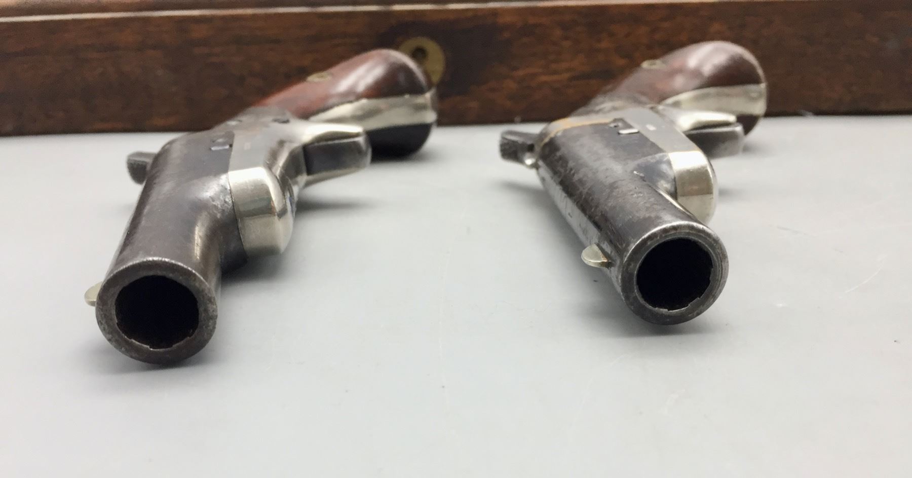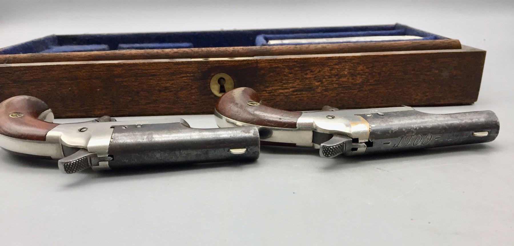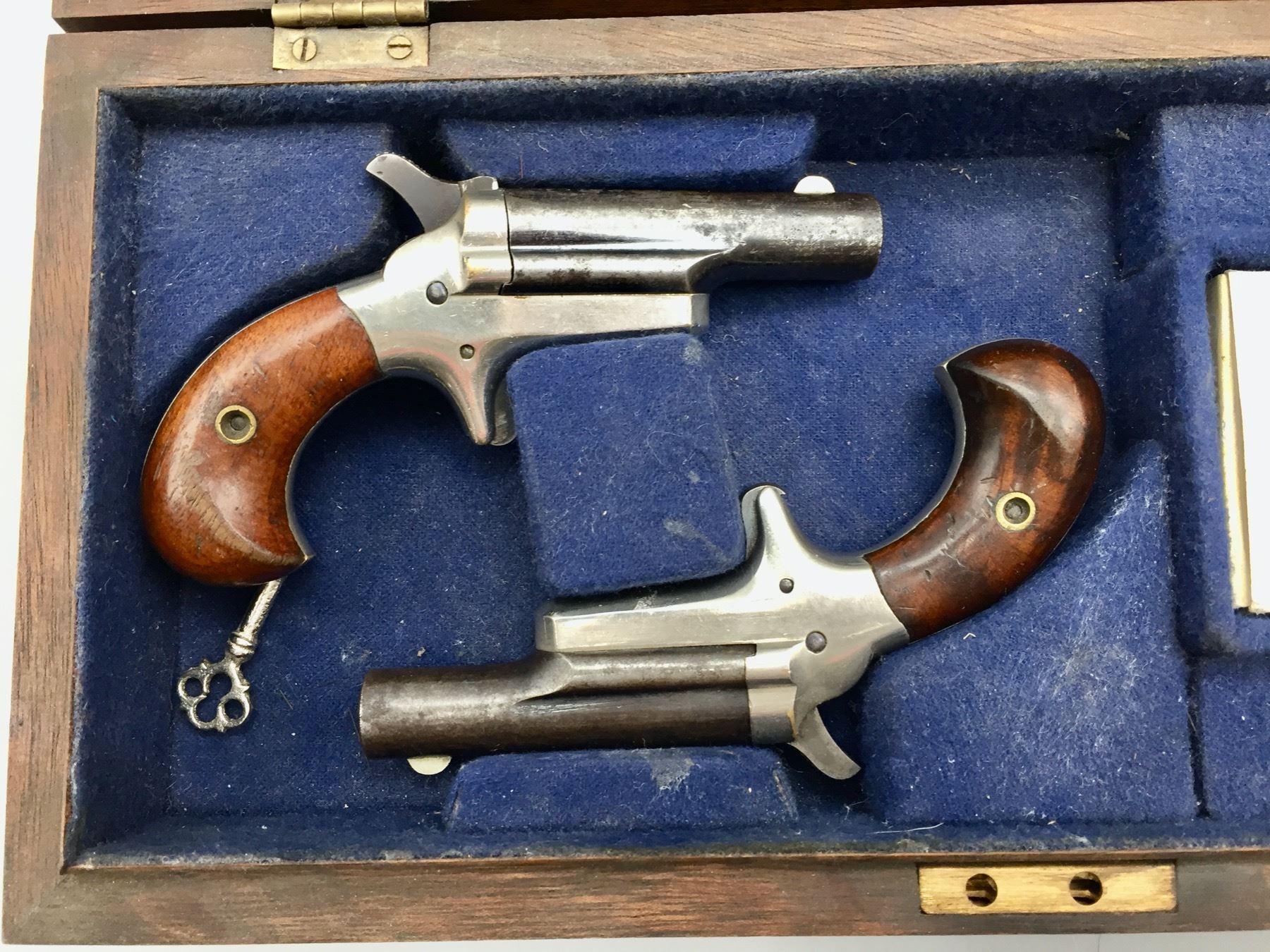 Description: Offered for sale in this lot are two Colt .41 caliber Derringers from circa 1870s - 1880s. They come in a nice presentation box which is modern made. Maker: Colt. Approx. Age: Circa 1870s - 1880s. Size: Barrel measures 2-1/2” with an overall length of 5-3/8”. Condition: Pretty good for its age, normal wear expected. Everything appears to function correctly. Please look closely at the pictures - they are an important part of our description. Shipping: There will be a $15 handling / packaging fee for shipping this lot. The actual cost of postage will be added on top of that. *****ANTIQUE - This firearm DOES NOT REQUIRE an FFL Transfer*****