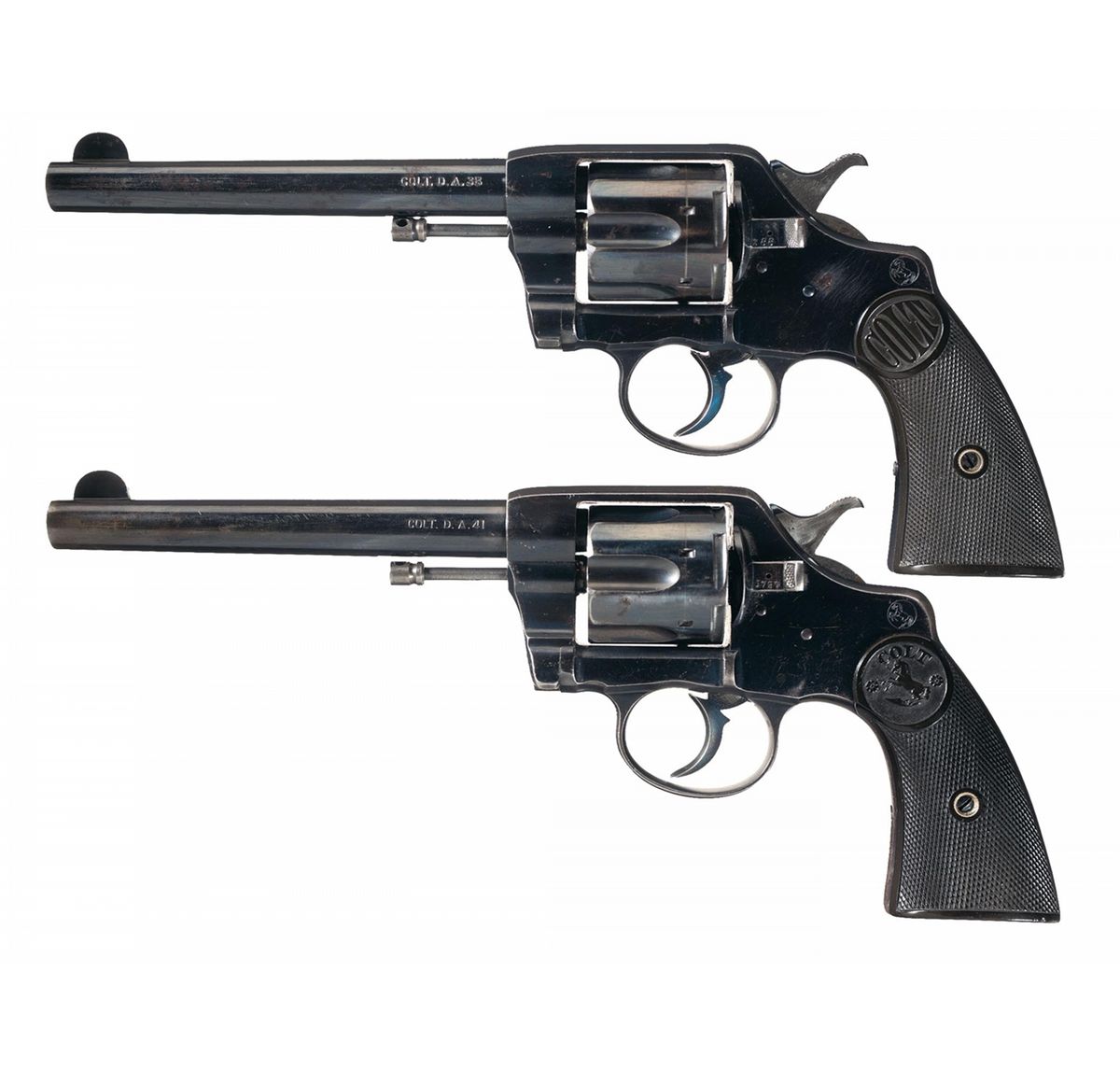 A) Manufactured in 1904. Standard markings, matching assembly number on the frame, crane and cylinder release, blade front and frame notch rear sights, and fitted with checkered hard rubber grips with "COLT" in an oval at the top.