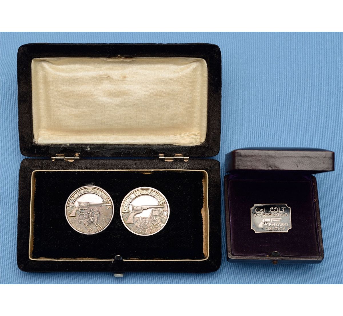 1 Peacemaker Coin and 1 Paterson Coin in a felt box and 1 Colt pin in a box. CONDITION: Very good or better overall.