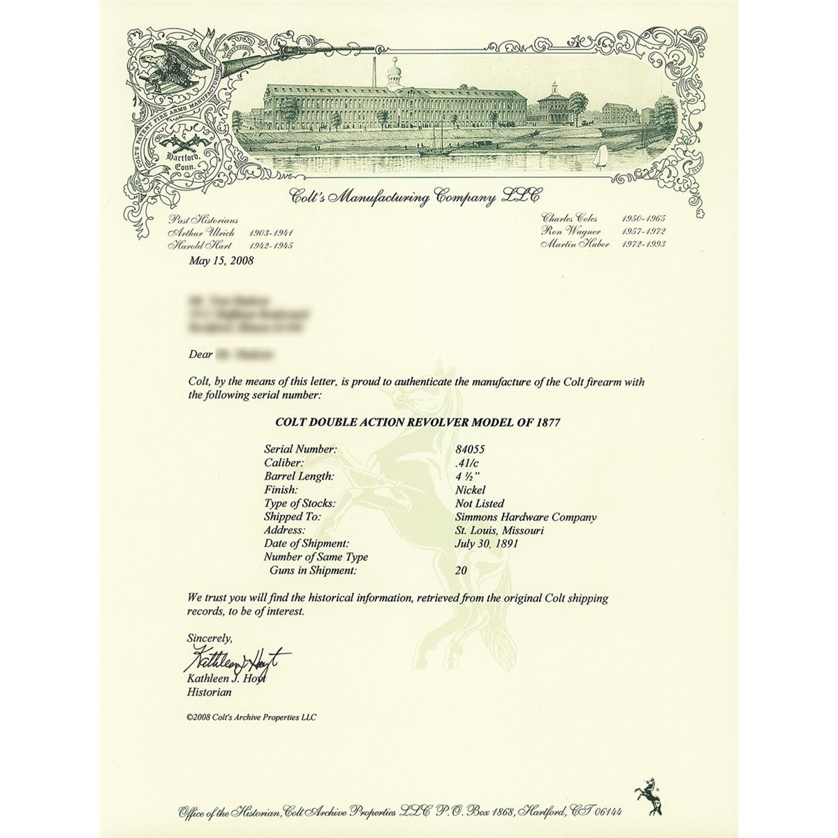 Factory letter confirms configuration, shipped to Simmons Hardware Co., St. Louis, Missouri, July 30, 1891.