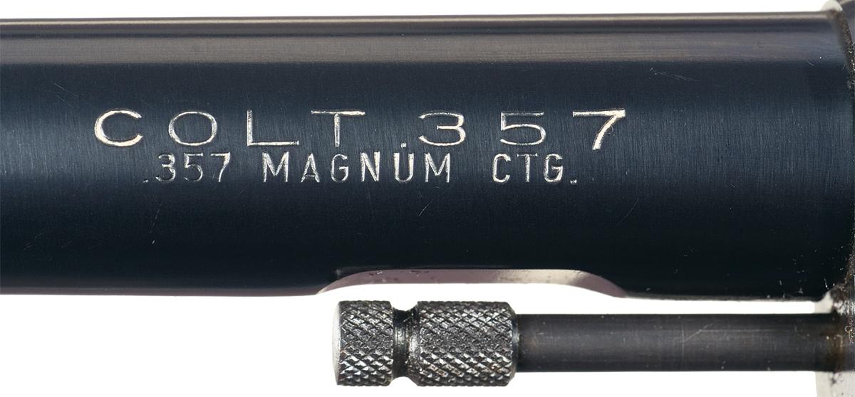 A) Manufactured in 1966. Pinned ramp blade front sight and adjustable rear sight, with standard barrel markings, serrated trigger, wide checkered hammer and checkered wraparound grips with silver Colt medallions.
