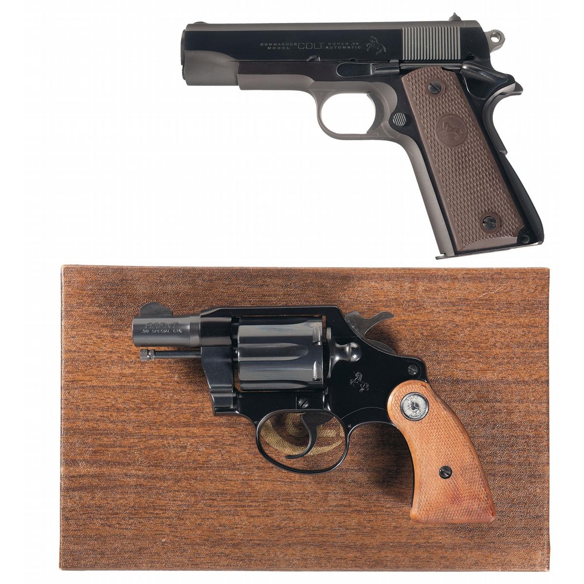 - B) Manufactured in 1968 with a fixed front and frame notch rear sights. Fitted with checkered walnut grips with silver Colt medallions. With two-piece box numbered to the gun.