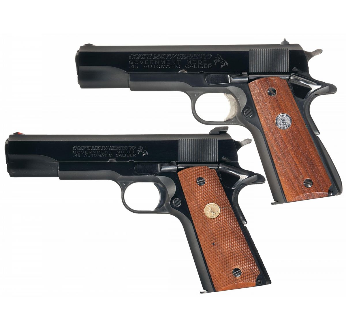 A) Manufactured between 1970 and 1976. Standard markings, blade and notch sights, serrated trigger, spur hammer, arched serrated mainspring housing and hardwood grips with Colt silver medallions. Comes with leather ammo pouch marked "U.S." and "GOVT 46" below it and two extra magazines.