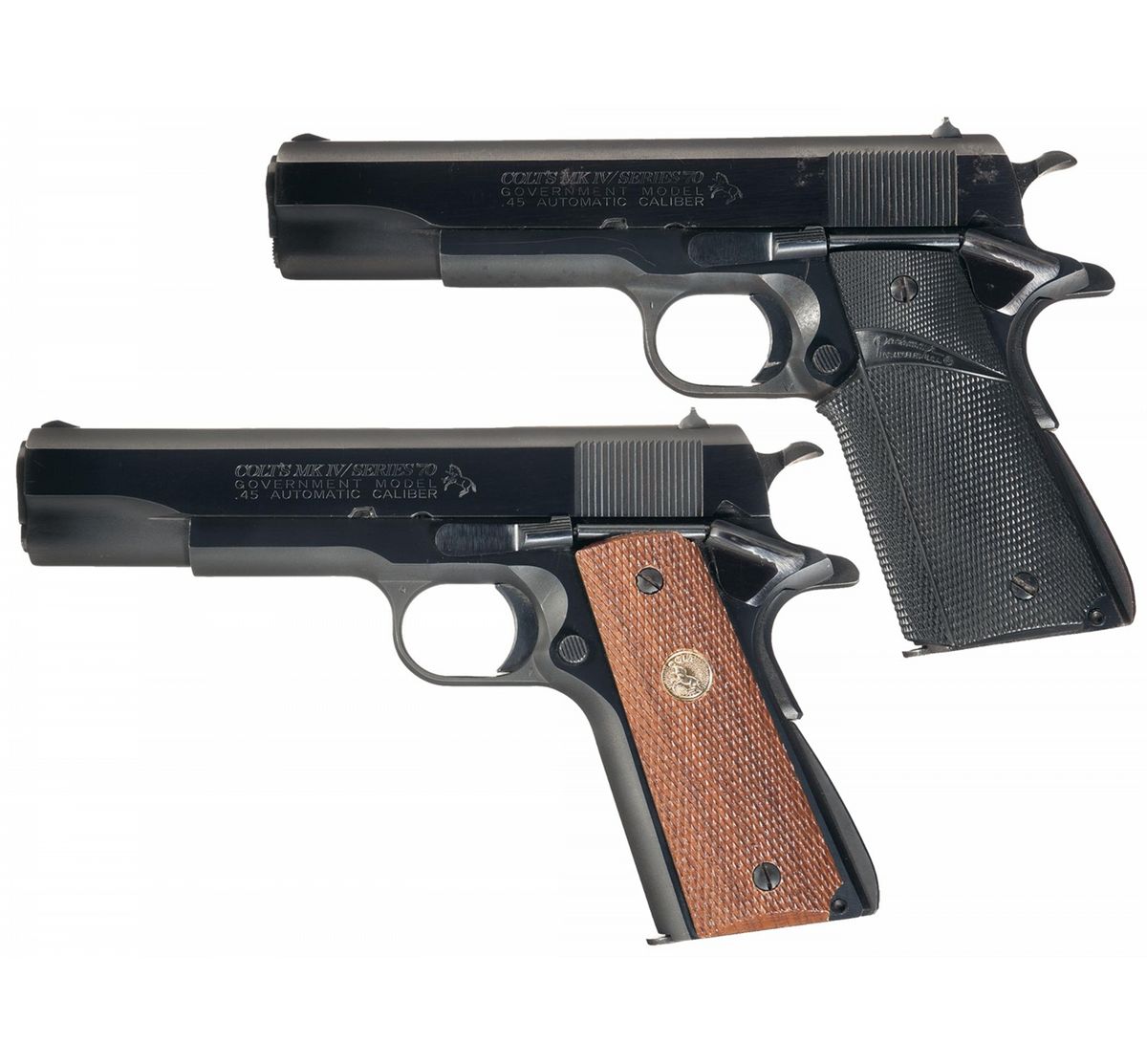 - B) Manufactured in 1982 with low profile fixed sights. The magazine release, slide stop, trigger, thumb safety and arched mainspring housing are serrated and the hammer is checkered. Fitted with a pair of checkered walnut grips with gold Colt medallions.