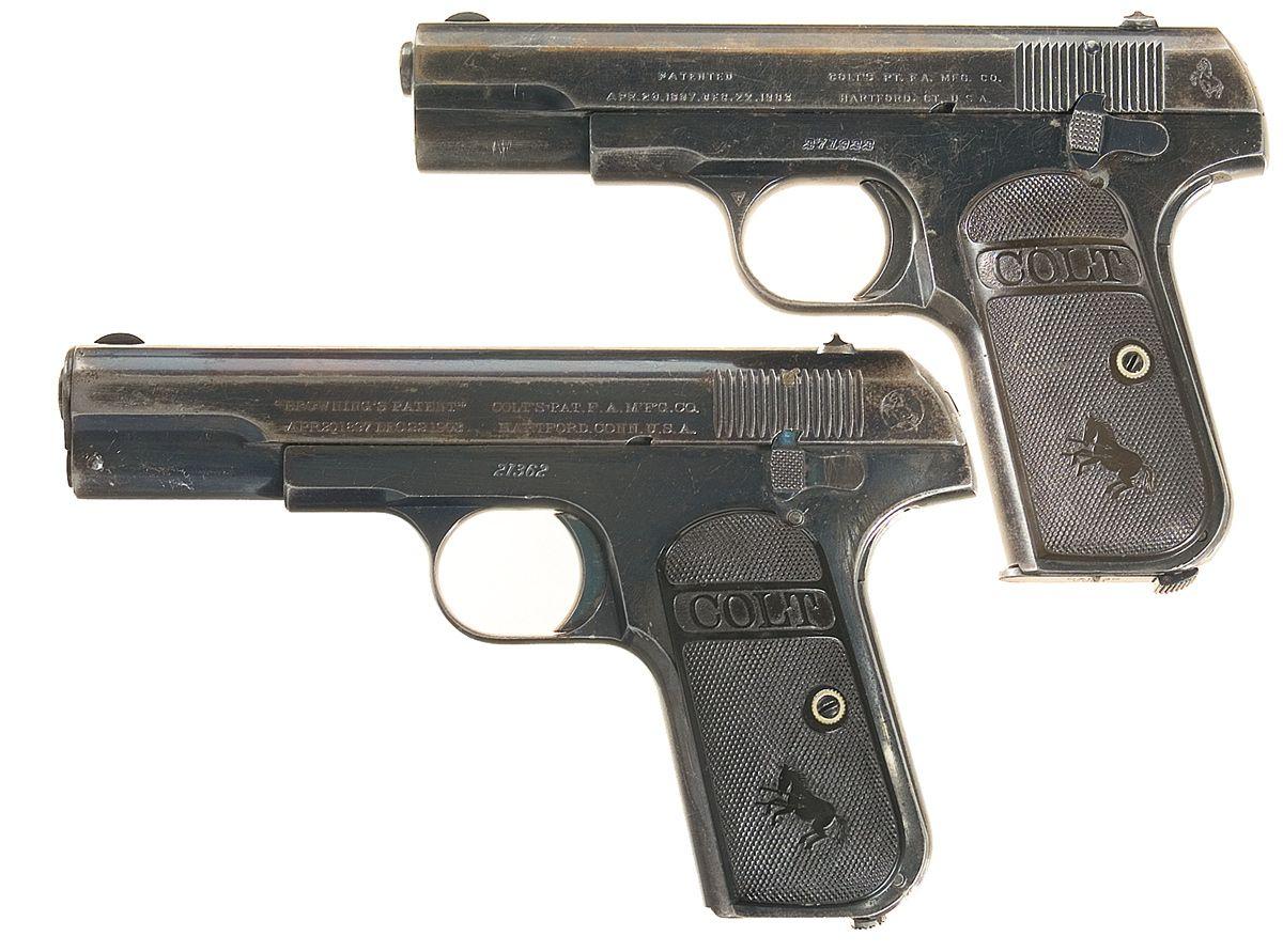 A) Made in 1918. Fixed sights, two block "PATENTED" slide markings, checkered grips with Colt banners.