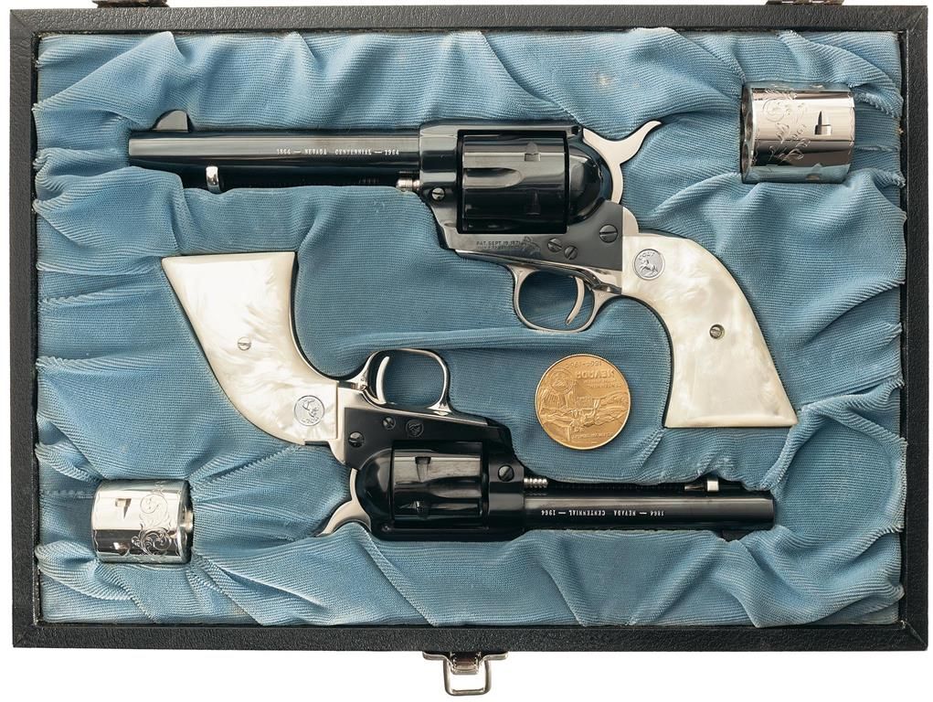 A) Manufactured in 1964. Standard commemorative markings and features. Complete with shared commemorative case and extra engraved nickel cylinder.