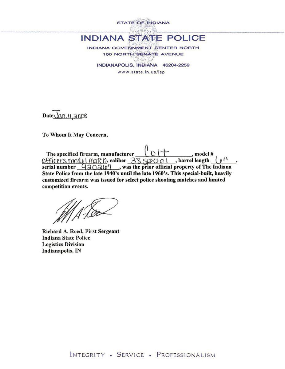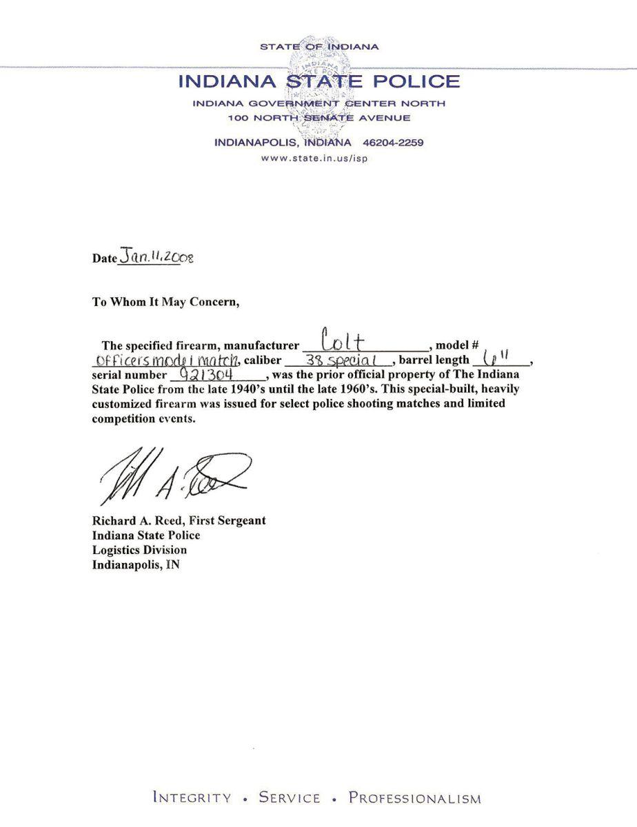 A) Manufactured in 1958 with "Ford Dealer's/1959" markings on right frame and standard features. Complete with Indiana State Police formal inspection letterhead stating this gun was a custom, special built revolver once owned by I.S.P.