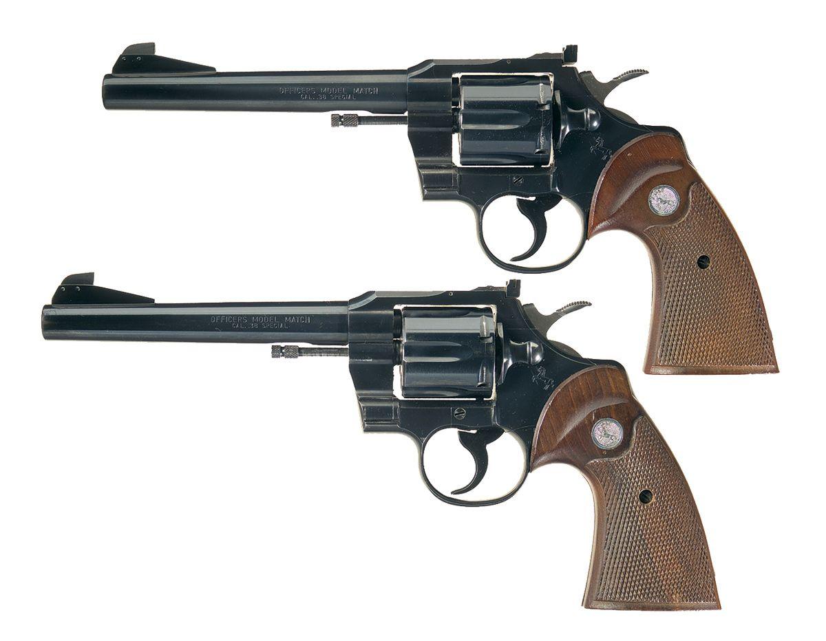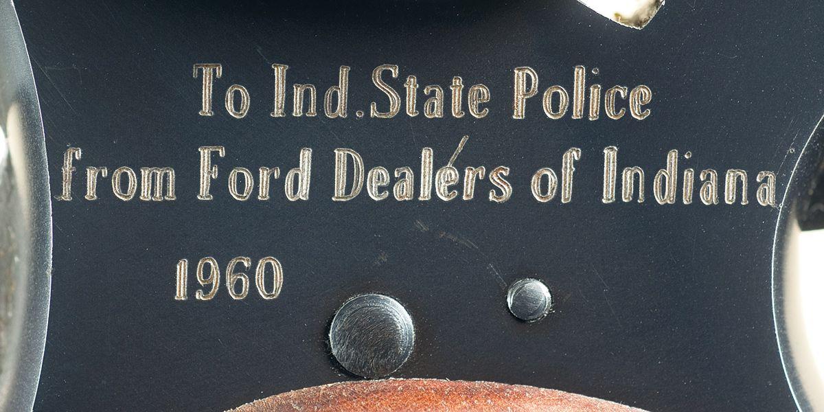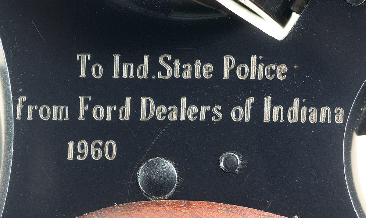 A) Donated by the Ford Dealers of Indiana in 1960 to the Indiana State Police shooting team, and engraved as such. Adjustable ramp Patridge front and notch rear sights, checkered wide hammer, serrated trigger and a set of checkered target grips. With Indiana State Police letter, confirming the revolver as police property.