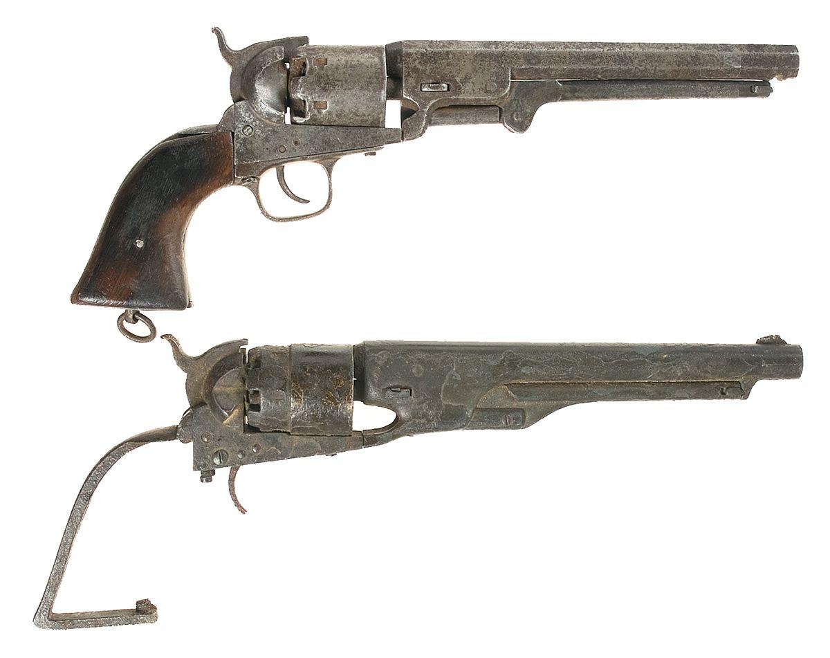 A) Produced in 1855 with Colt London barrel address, matching visible numbers (backstrap no longer visible). Loading lever latch and front sight are absent, ground hammer sides, nipples heavily battered, replacement two piece grips and some screws, added lanyard ring. Action needs work, doesn't function.