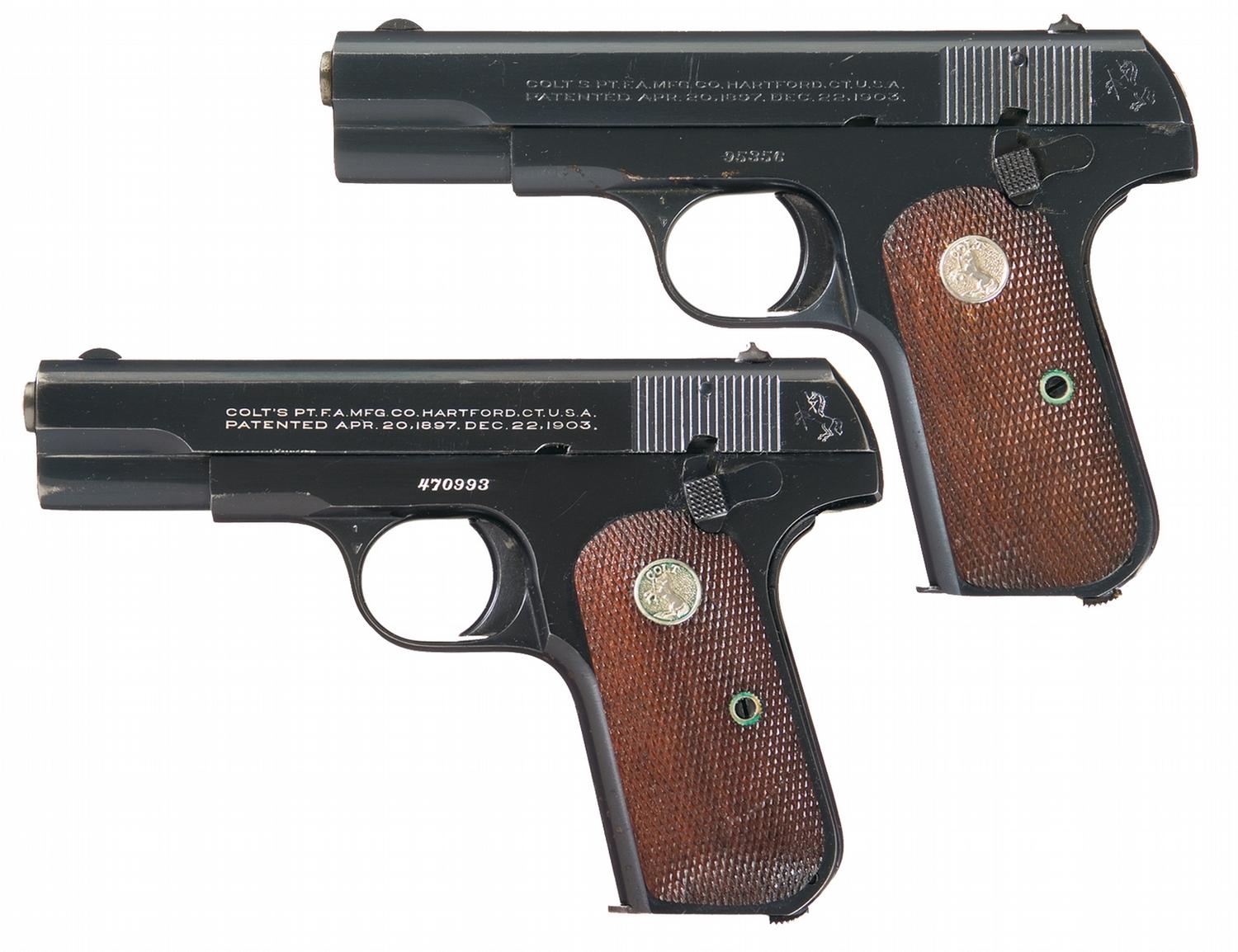 Manufactured in 1927. Fixed sights, with the two line address / 1897, 1903 patent dates on the left side of the slide with the Rampant Colt behind the serrations, and "COLT AUTOMATIC / CALIBRE 32 RIMLESS SMOKELESS" on the reverse below the ejection port. "1 / VP" on the front upper left side of the trigger guard and "48" on the opposite, and fitted with checkered walnut grips with silver colt medallions.