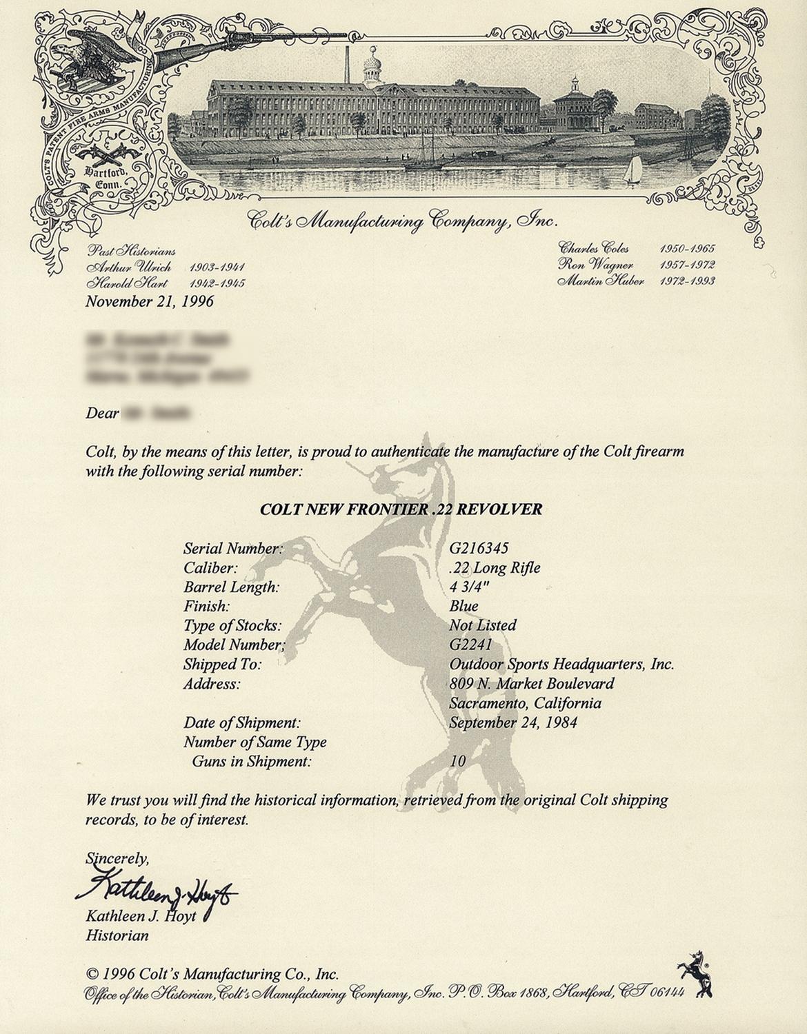 A) The included Colt factory letter confirms the serial number, caliber, and blue finish with the type of stock not listed and the barrel length incorrectly listed at 4 3/4". (the 3 is probably type). The letter states that the revolver was shipped on September 24, 1984 to Outdoor Sports Headquarters Sacrament, California, as part of a 10 gun shipment. Standard markings highlighted in gold, adjustable rear sight, Rampant Colt/Federal Eagle grips. Complete with box numbered to gun with incorrect barrel length.