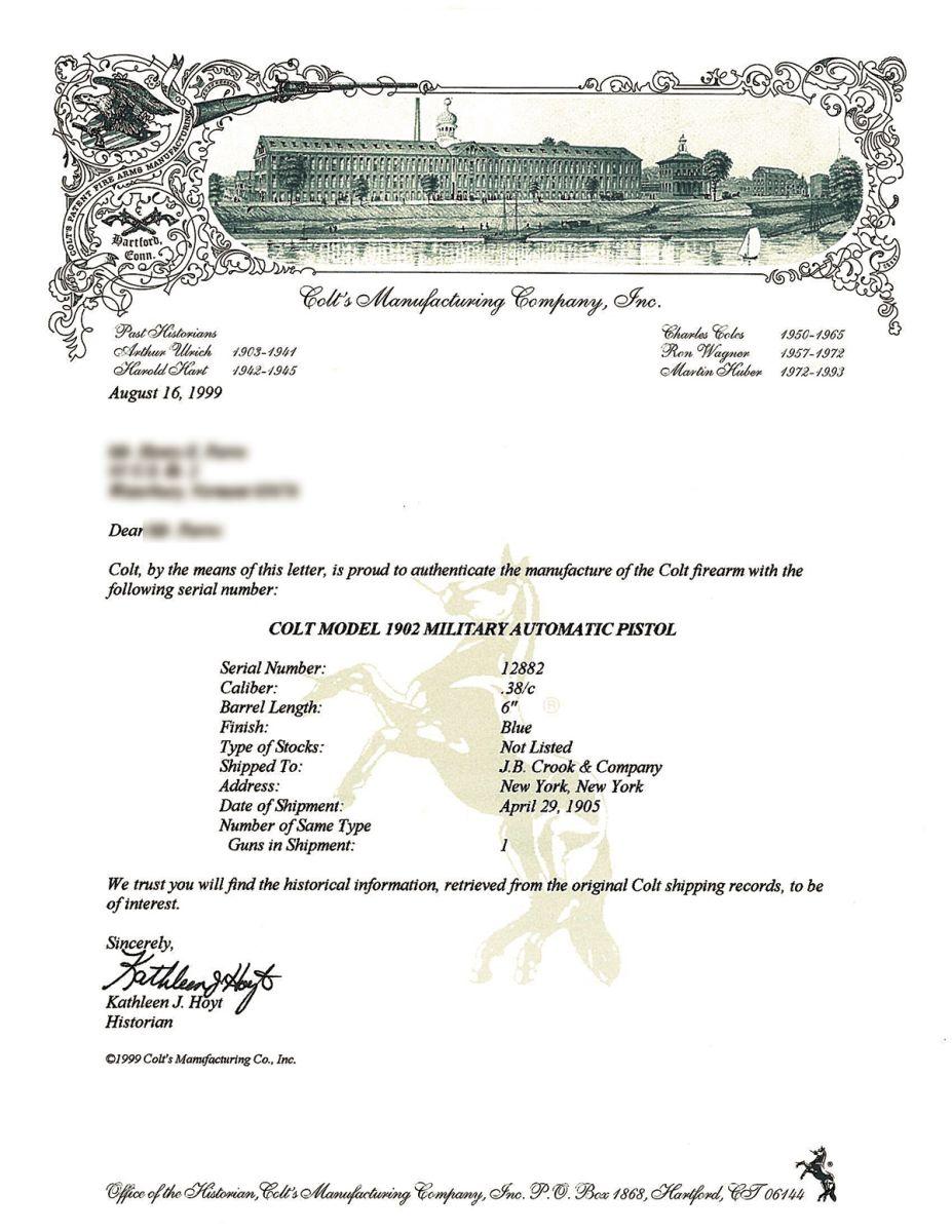 A) Manufactured in 1905 with the cross checkered slide serrations on the front of the slide, military square butt and lanyard loop. Standard markings, the factory letter confirms shipment to J.B. Crook & Company in New York City on the 29th of April 1905.