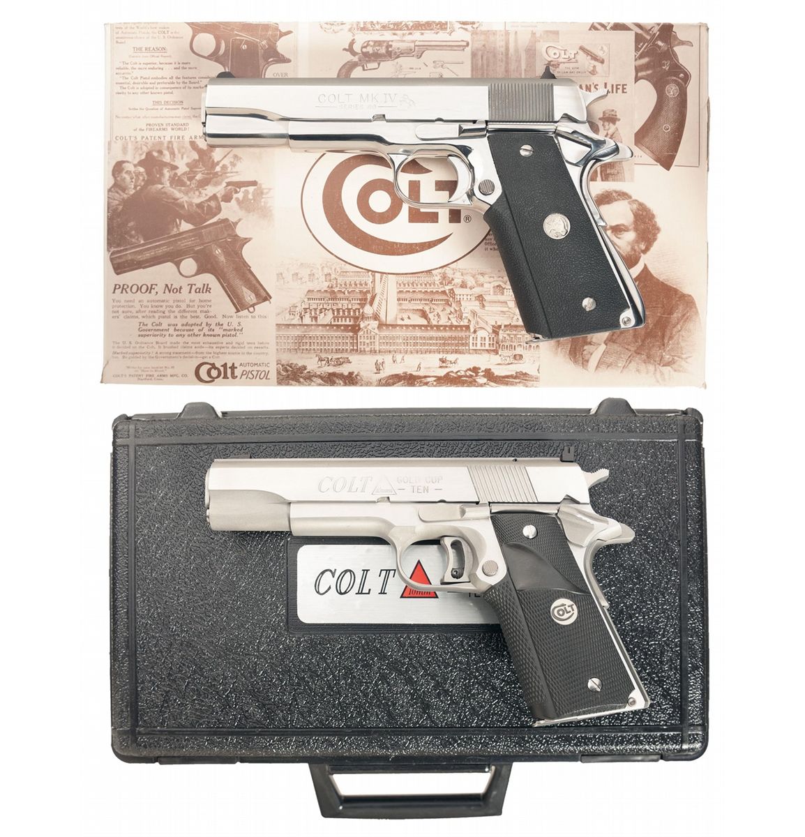 A) Manufactured circa 1990. The trigger, magazine release, slide stop, thumb safety, hammer and arched mainspring housing are serrated. With blue plastic Colt case and picture box numbered to gun.