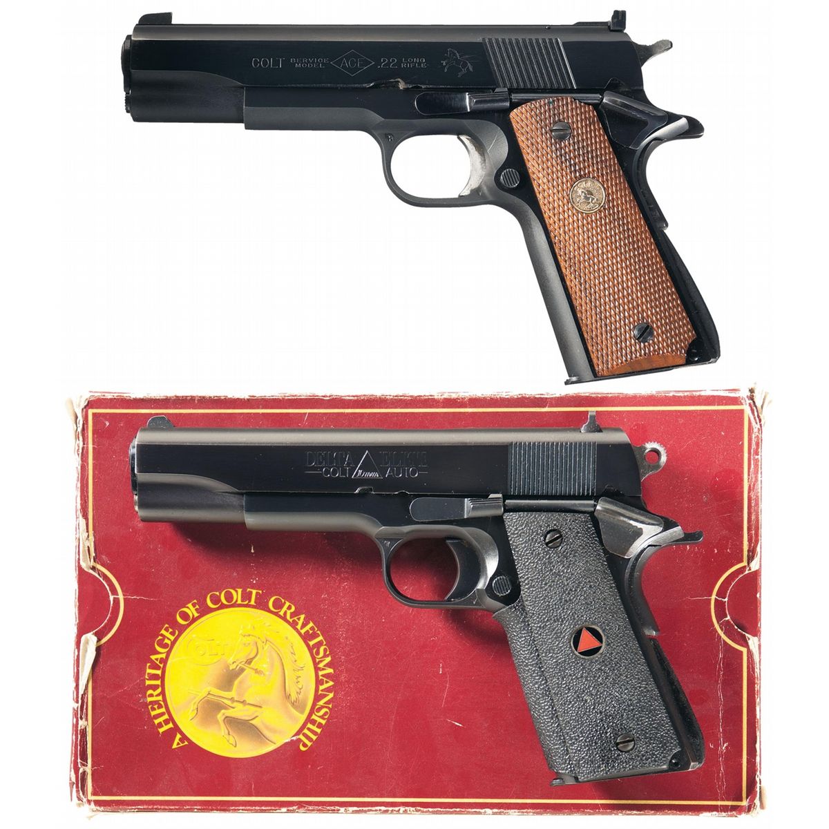 A) Manufactured in 1979. Standard markings with adjustable rear and fixed front sights (front sight having high visible paint added to the face). Fitted with checkered Colt medallion grips. With original factory magazine with base marked "COLT / .22 L.R." and with Rampant Colt. Matte blue finish with high polished blue sides.