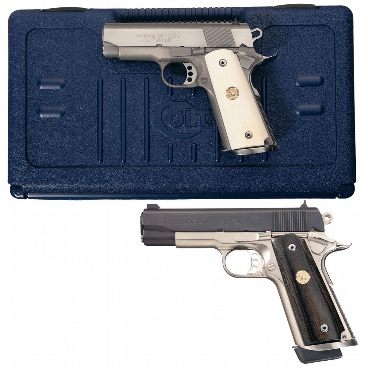 - B) Equipped with a three white dot sight sight system, combat hammer, and skeletonized trigger. Standard markings on the left of the slide with only model marking on the right. Fitted with smooth grips with gold Colt medallions, and includes an extra set of checkered walnut Colt medallions.