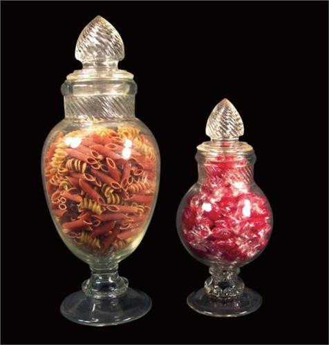 Two Columbia Candy Jars with loose fit tops. No chips or cracks. 15 1/2 and 11 inches tall.