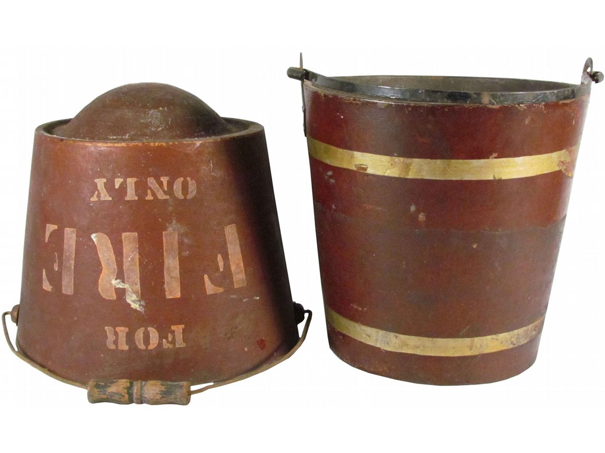Two Composition Fire Buckets. Flat bottom bucket has heavy metal handle and initials A.D.T. impressed in bottom, red paint with gold bands, very good condition, 10 1/2 inches tall. Round bottom bucket has wire/wood handle, chip to top interior edge of bucket, 11 inches tall.
