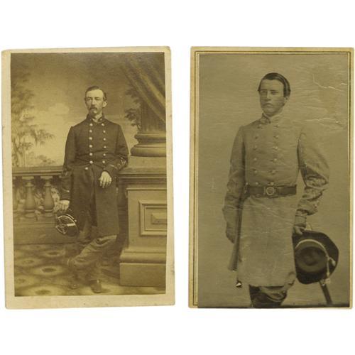 <B>Identified and Anonymous Confederate Officer CDVs.</B></I> Carte de visite of Captain William A. Pegram, Company "F", 21st Virginia Infantry, P.E. Gibbs, Richmond, Virginia backmark. Pegram, who enlisted as a private in 1861, became a company commander on May 20, 1863. He came up from Virginia to re-join Lee's Gettysburg as it retreated from Gettysburg and was killed leading a charge in Williamsport, Maryland on July 7, 1863. The youthful Pegram is shown in the full regulation uniform of a Confederate captain in this image taken shortly before his death. Of special interest is the two-piece "CS" plate on his belt rig. Some crazing to the emulsion, minor wear and a pencil ID on the verso. Very good condition. This excellent CDV was published in Bill Turner's "Confederate Faces", page 81, Vol. II; The second CDV is a studio portrait of a Confederate major wearing a double-breasted frock coat having 14 staff buttons and regulation insignia. He holds a kepi having a very dark band, suggesting that he might be a surgeon. No backmark, light aging as expected, fine condition.<BR><BR><b>Shipping:</b> Small Flat (<a target="_blank" href="http://www.heritageauctions.com/common/shipping.php">view shipping information</a>) <BR><BR><B>Important notice: