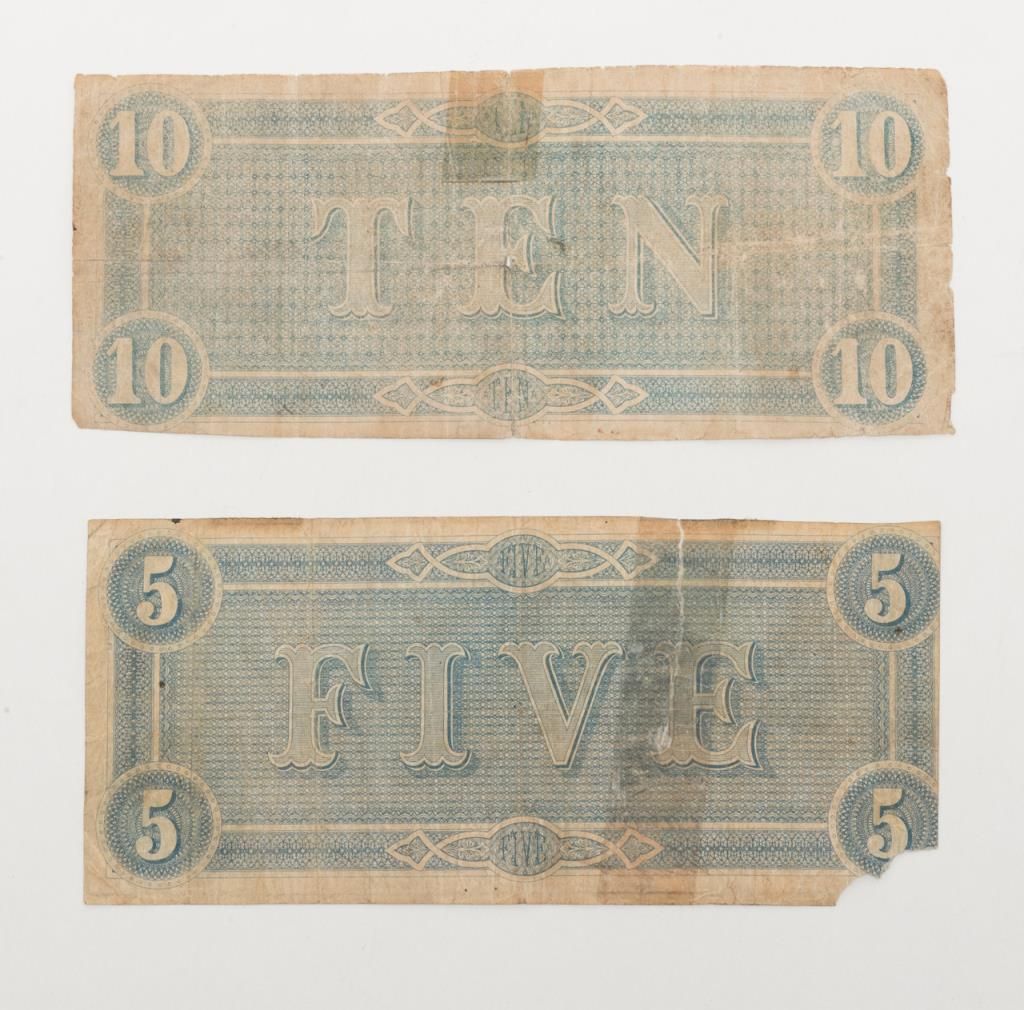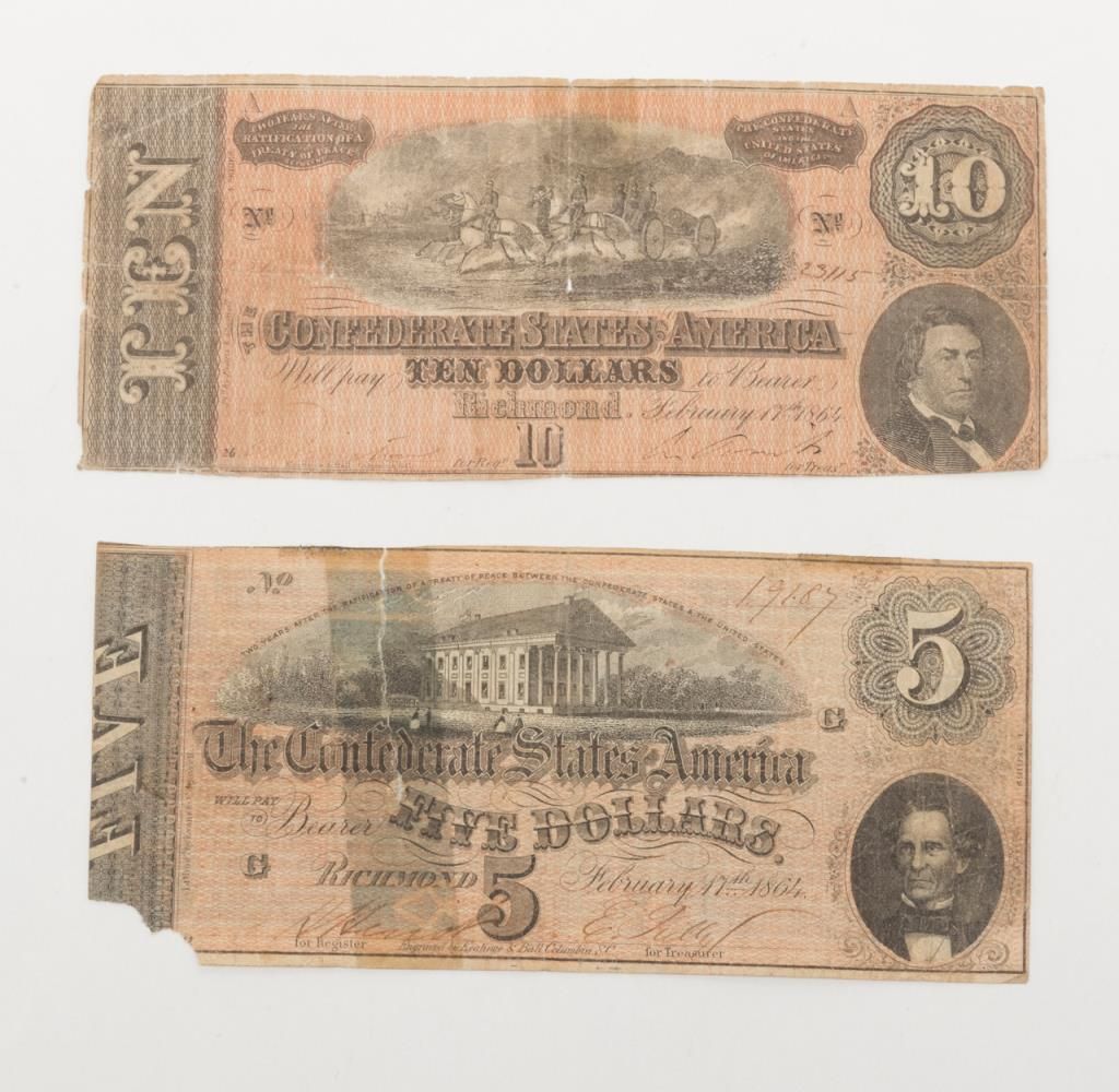 Two Confederate promissory notes (Similar to modern currency) in $10 and $5 denominations. $10 note shows artilleryman and the center number 23115 in ink with signatures issued at Richmond. The cut of the note is irregular and there is some taping and small losses on the corners and edges. The $5 note shows a loss at one corner also issued at Richmond with picture of state house at the center numbered 19187 and dually signed by Tully and another illegible party marked “engraved by the Keahinge and Ball of Columbia, South Carolina. Also irregularly cut with staining, losses and some taping. Est.: $100-$200