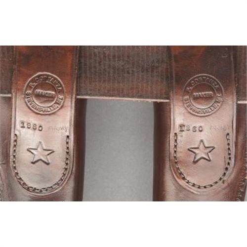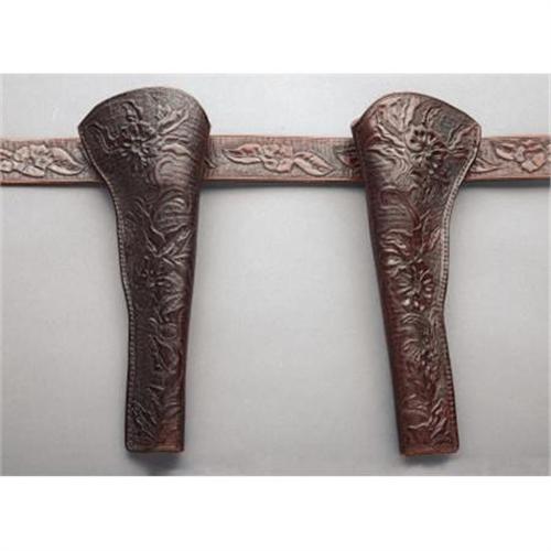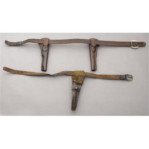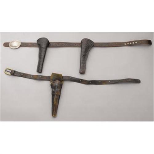 <B>TWO CONTEMPORARY GUN RIGS</B></I> - <BR> a) Double Frontier Rig by F. Costanza - Stevensville, Montana; Deep flower tooling for long barrel army; Concho buckle.<BR> b) Crudely made long holster on plain belt.<BR><BR><b>Shipping:</b> Miscellaneous Collectibles, Larg (<a target="_blank" href="http://www.heritageauctions.com/common/shipping.php">view shipping information</a>)