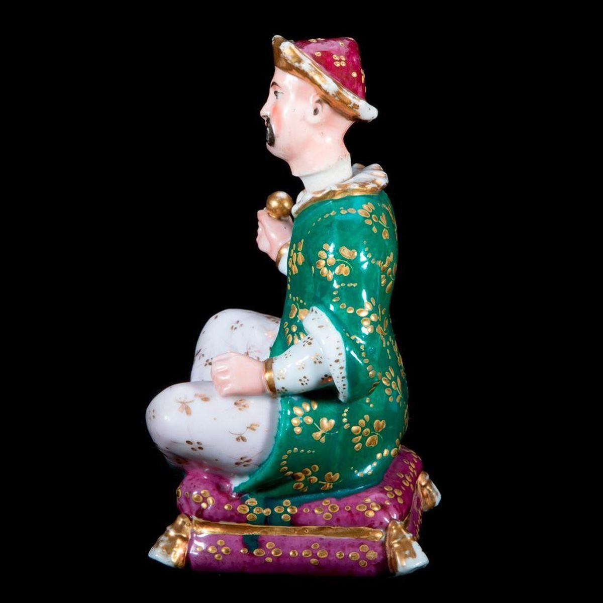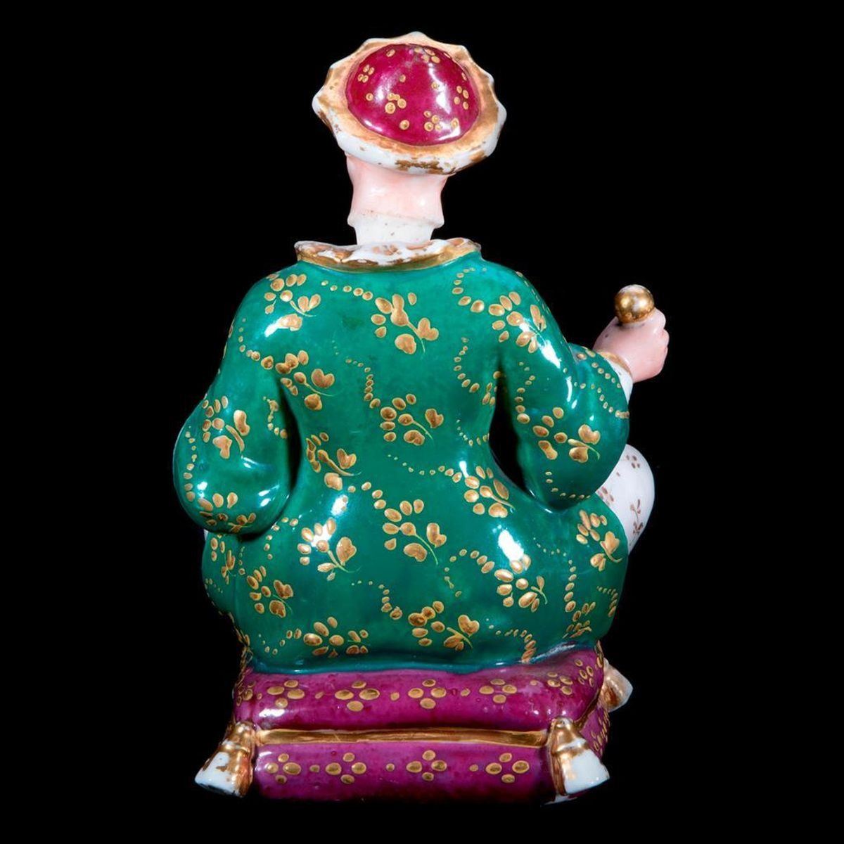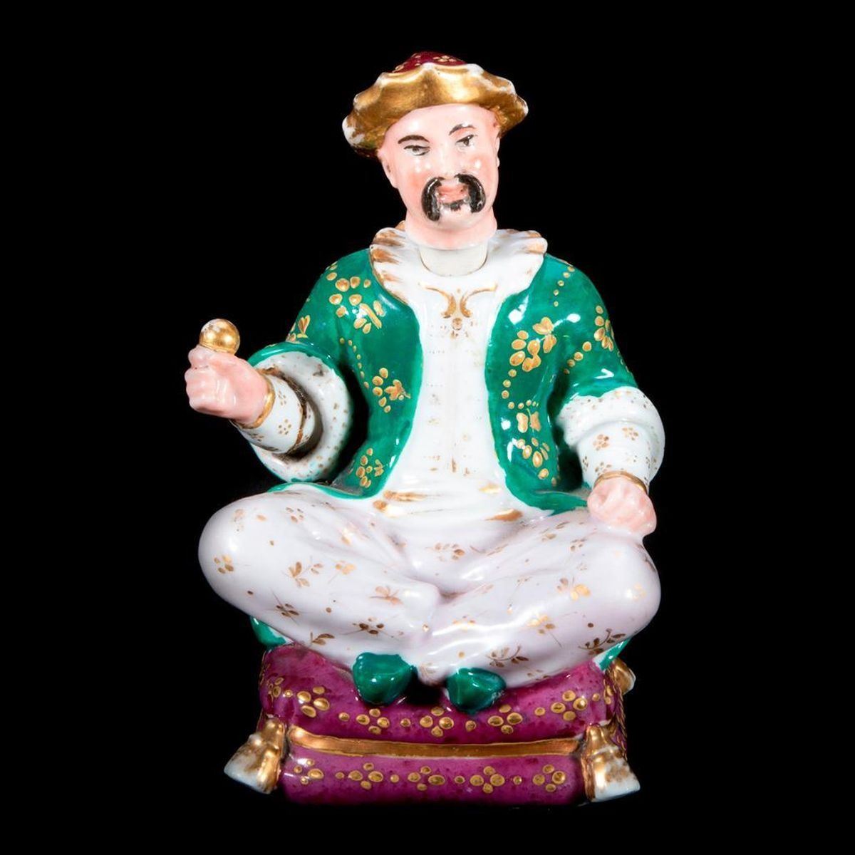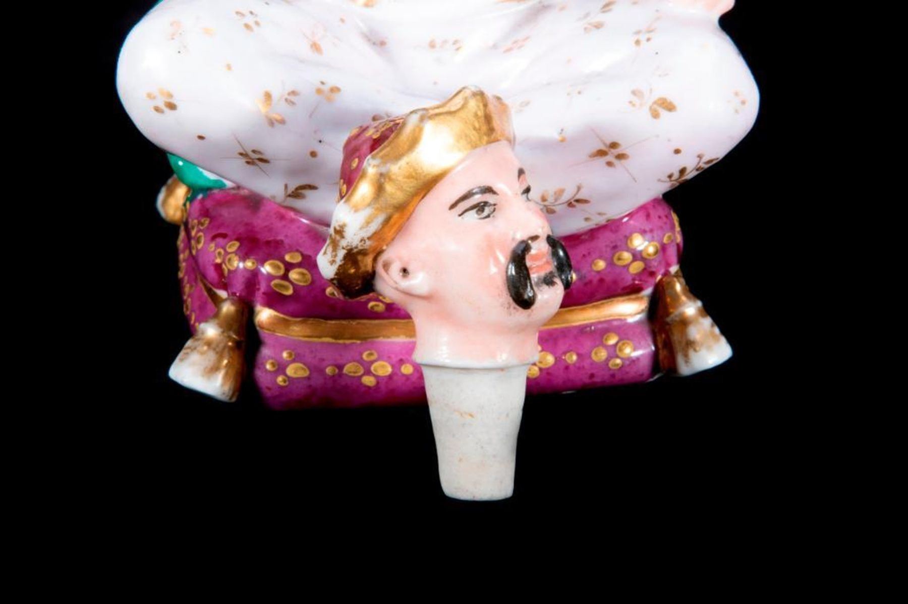 Two Continental Figures, maiden at the and the other a male figure as a scent bottle sitting on cushions. Tallest: H-9" maiden Condition: chip on the base of the maiden