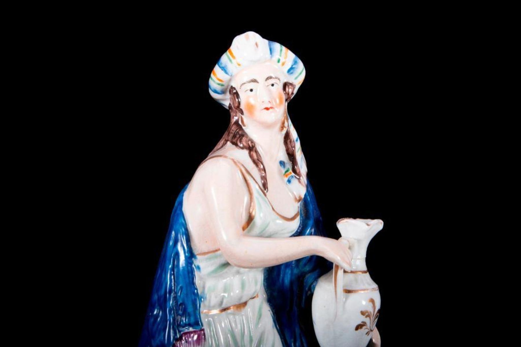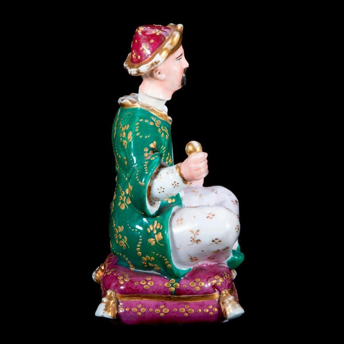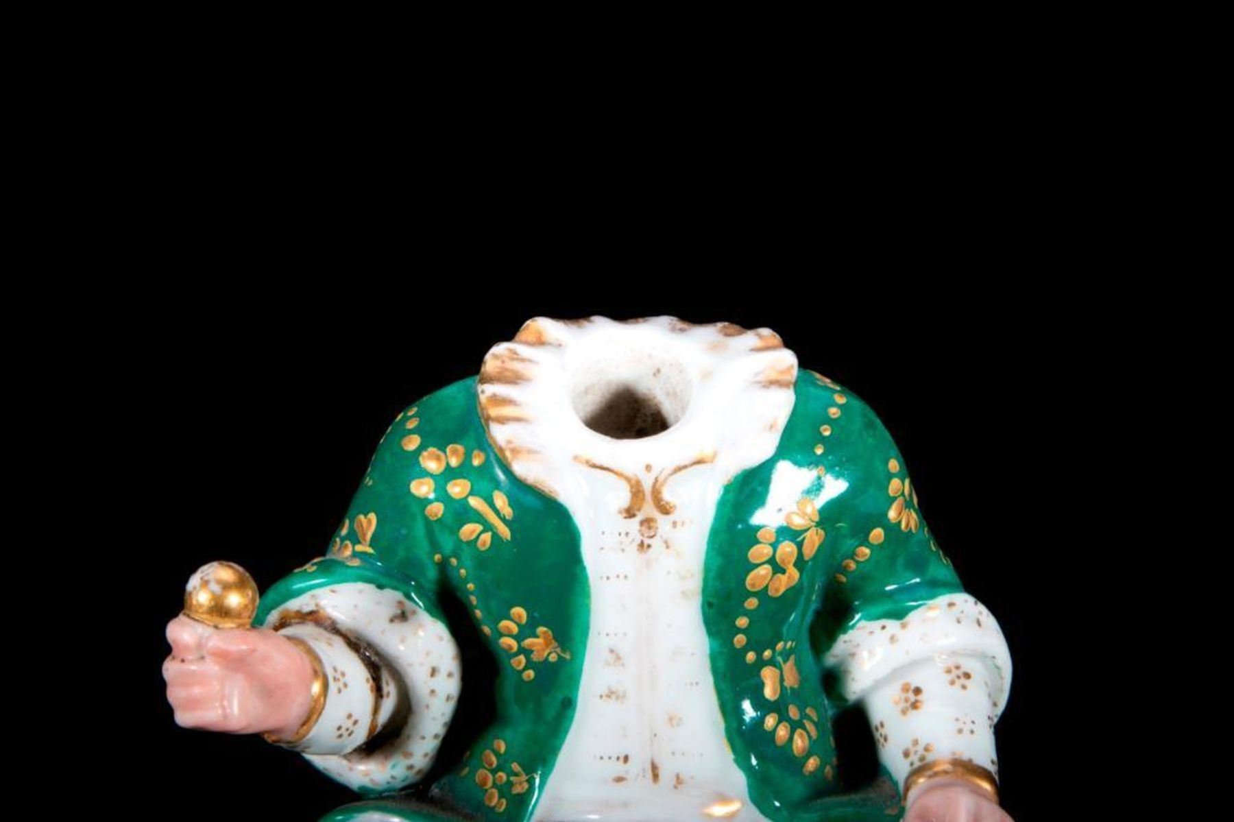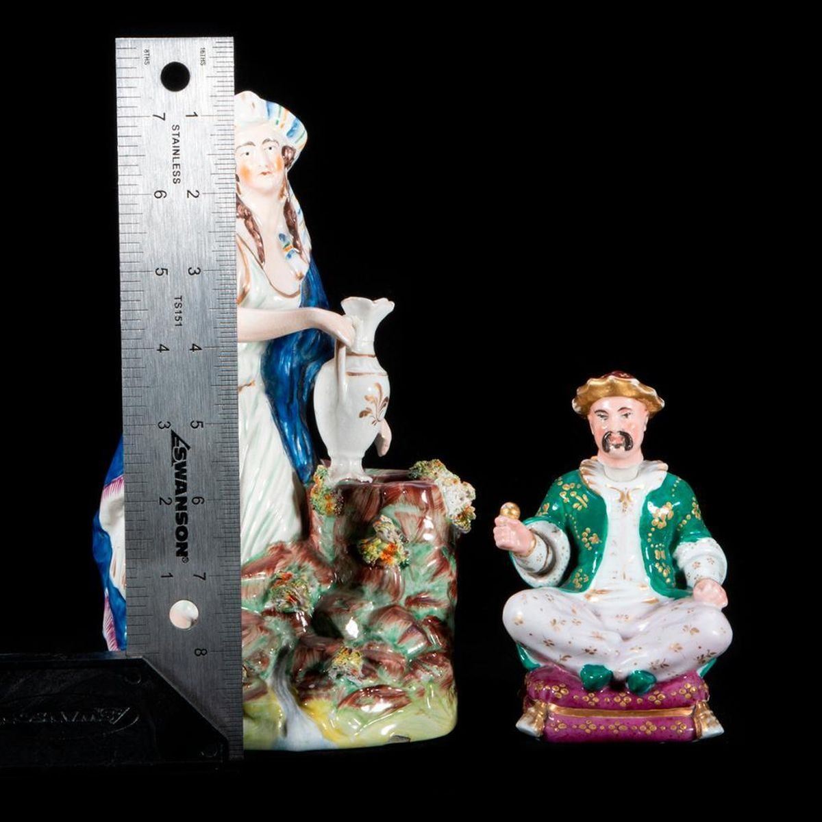 Two Continental Figures, maiden at the and the other a male figure as a scent bottle sitting on cushions. Tallest: H-9" maiden Condition: chip on the base of the maiden