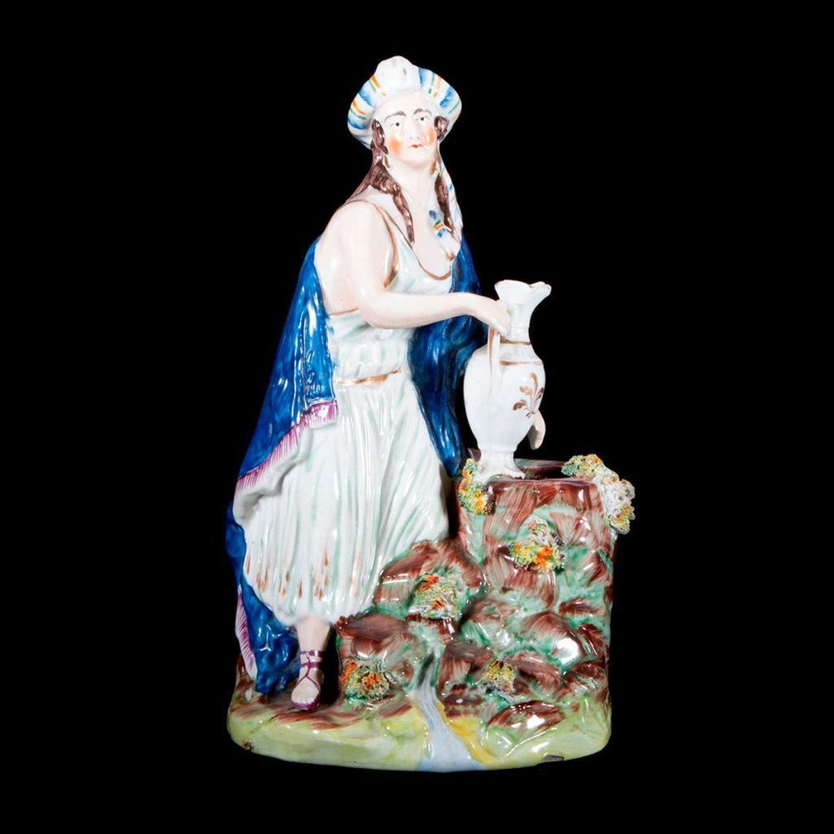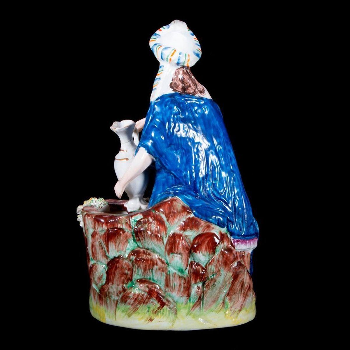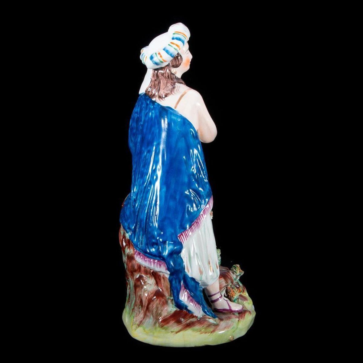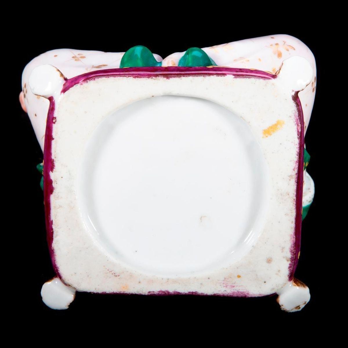 Two Continental Figures, maiden at the and the other a male figure as a scent bottle sitting on cushions. Tallest: H-9" maiden Condition: chip on the base of the maiden