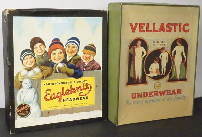 Two Country Store Product Boxes. Eagleknit Headwear and Velastic Underwear for ladies union suits. Great color and graphics. Both in excellent condition. Vellastic measures 11 X 3 X 14 inches.
