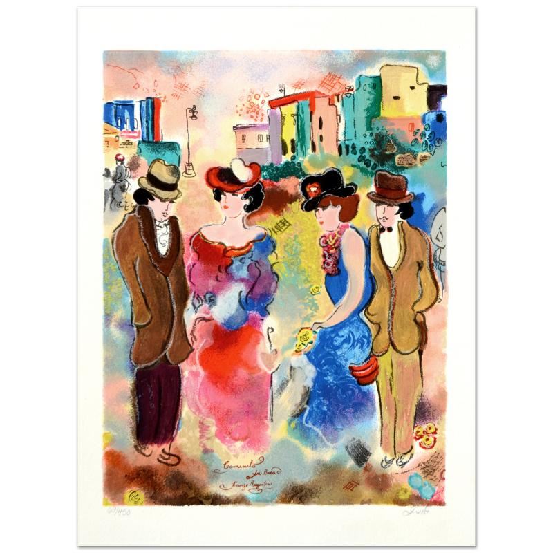 "Two Couples" is a limited edition serigraph on paper by Zule, numbered and hand signed by the artist! Includes certificate of authenticity! Measures Approx. 11.5" x 15.5" (with border), 9.5" x 13.5" (image).