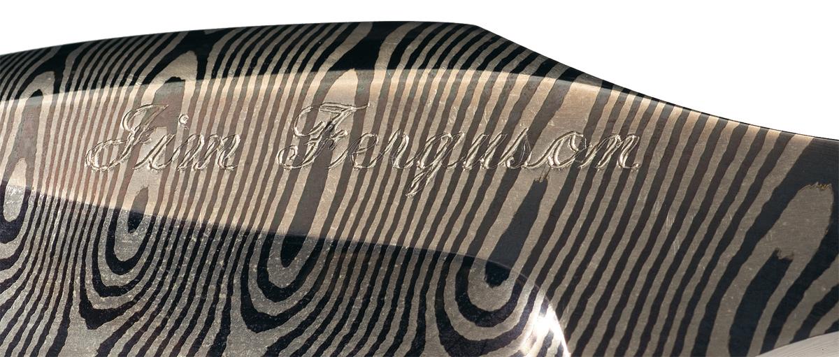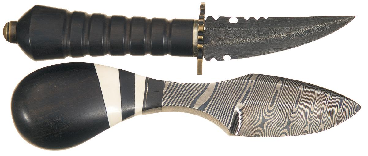 1) Jim Ferguson handcrafted knife with a 2 inch Damascus blade marked in script "Jim Ferguson". Hardwood handle with two bands of ivory. OAL: 5 1/2". Making his first knife in 1985, Ferguson is a knifemaker who intends for his knives to be carried and used. 2) Tai Goo handcrafted knife with a 2 3/4 inch artfully shaped Damascus blade. The brass guard has a half circle punched pattern around the blade. Grooved hardwood handle. Standard chiseled signature. OAL: 6 1/2". Goo has established himself as a world renowned neo-tribal knifemaker and is the founder of the Neo-Tribal Metalsmiths.