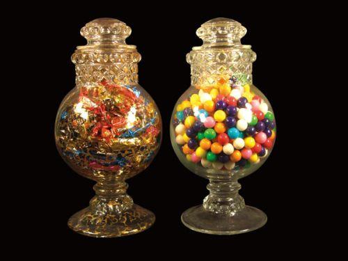 Two Dakota Candy Jars, one with applied gold. No chips or cracks. Both 12 inches tall.