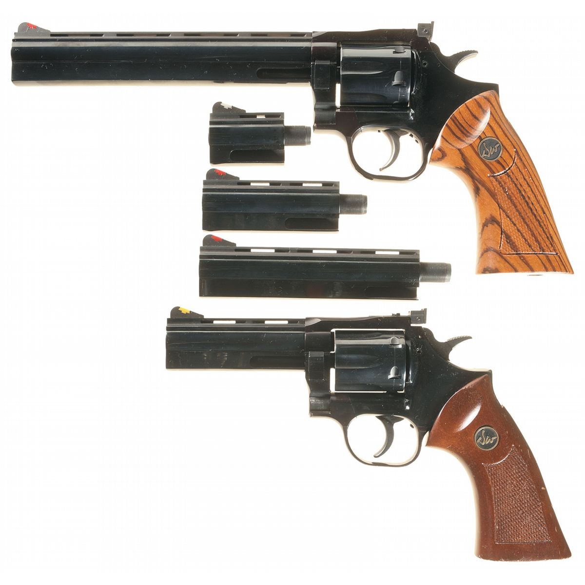 6" barrel, 2 1/2" barrel, 4" barrel, finger groove walnut grip. With extra grip.